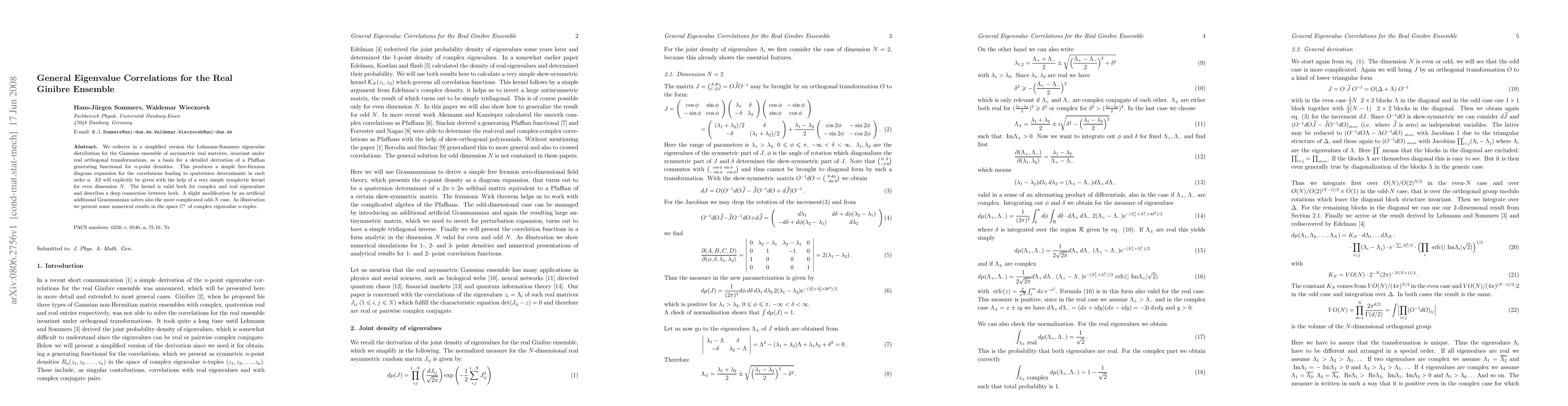 Researchers rederive a simplified formula for eigenvalue distributions in real Gaussian matrices, leading to a Pfaffian generating functional that can be used to calculate correlations between quaternion determinants.