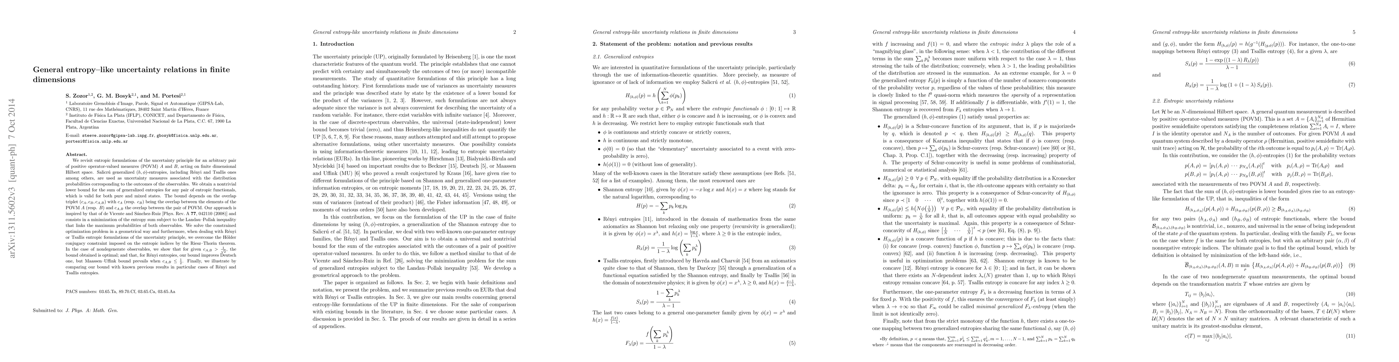 We revisit entropic formulations of the uncertainty principle for an arbitrary pair of positive operator-valued measures (POVM) $A$ and $B$, acting on finite dimensional Hilbert space. Salicr\'u generalized $(h,\phi)$-entropies, including R\'enyi and Tsallis ones among others, are used as uncertainty measures associated with the distribution probabilities corresponding to the outcomes of the observables. We obtain a nontrivial lower bound for the sum of generalized entropies for any pair of entropic functionals, which is valid for both pure and mixed states. The bound depends on the overlap triplet $(c_A,c_B,c_{A,B})$ with $c_A$ (resp. $c_B$) being the overlap between the elements of the POVM $A$ (resp. $B$) and $c_{A,B}$ the overlap between the pair of POVM. Our approach is inspired by that of de Vicente and S\'anchez-Ruiz [Phys.\ Rev.\ A \textbf{77}, 042110 (2008)] and consists in a minimization of the entropy sum subject to the Landau-Pollak inequality that links the maximum probabilities of both observables. We solve the constrained optimization problem in a geometrical way and furthermore, when dealing with R\'enyi or Tsallis entropic formulations of the uncertainty principle, we overcome the H\"older conjugacy constraint imposed on the entropic indices by the Riesz-Thorin theorem. In the case of nondegenerate observables, we show that for given $c_{A,B} > \frac{1}{\sqrt2}$, the bound obtained is optimal; and that, for R\'enyi entropies, our bound improves Deutsch one, but Maassen-Uffink bound prevails when $c_{A,B} \leq\frac12$. Finally, we illustrate by comparing our bound with known previous results in particular cases of R\'enyi and Tsallis entropies.