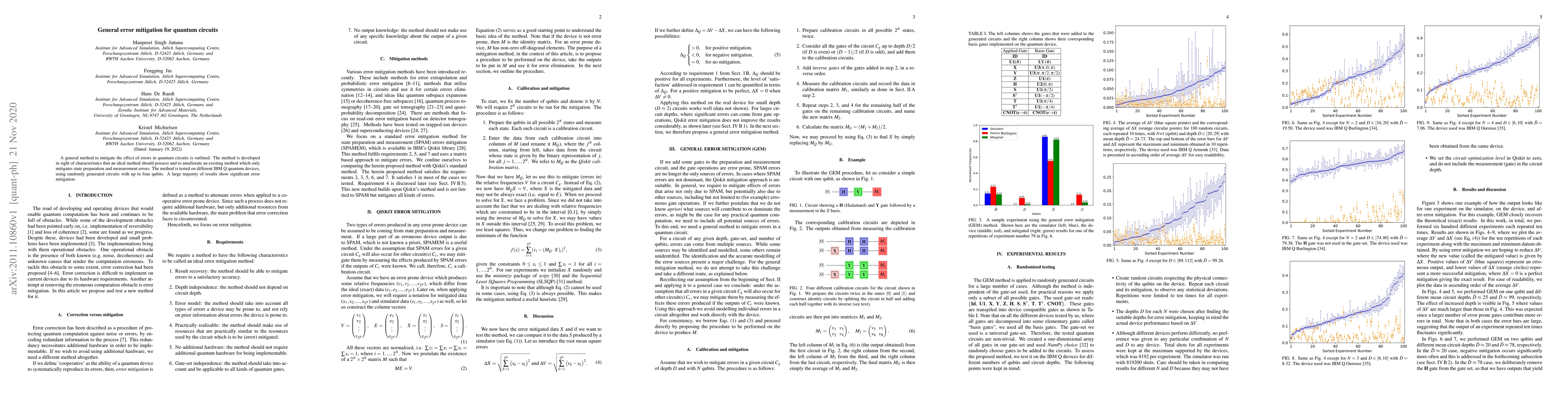 This paper proposes a general error mitigation technique for quantum circuits, enhancing existing methods to address broader error types. Tests on IBM Q devices with up to four qubits show significant error reduction in most cases.