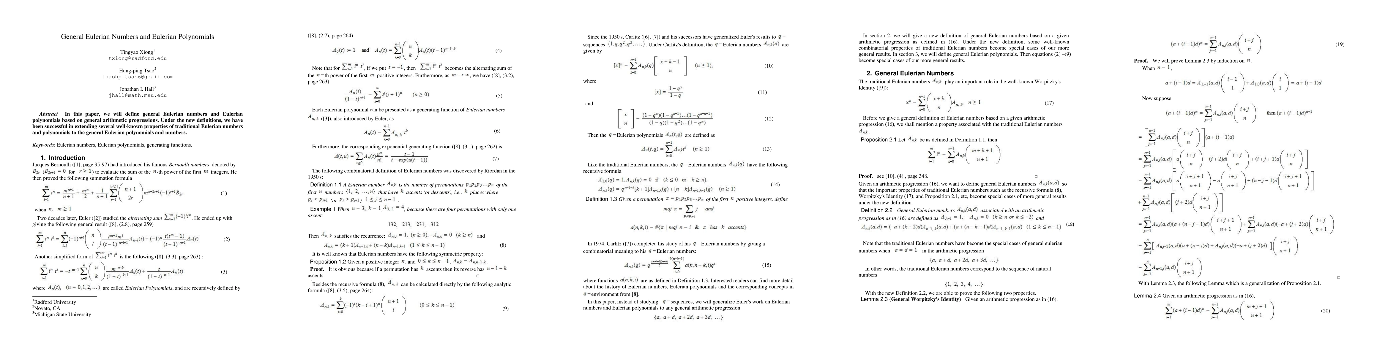 This paper introduces general Eulerian numbers and polynomials based on arithmetic progressions, extending several properties of traditional Eulerian constructs to this new framework. These generalizations enhance the understanding and applications of Eulerian sequences.