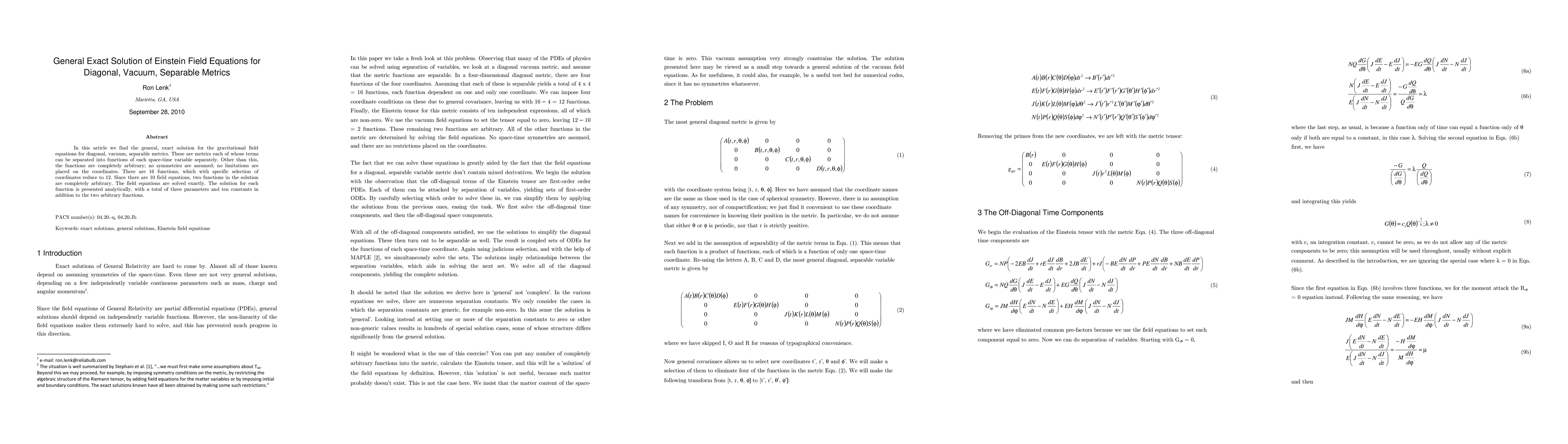 This paper finds the general solution to Einstein's gravitational field equations for diagonal, vacuum, separable metrics, which can describe a wide range of spacetime geometries with arbitrary functions and parameters.