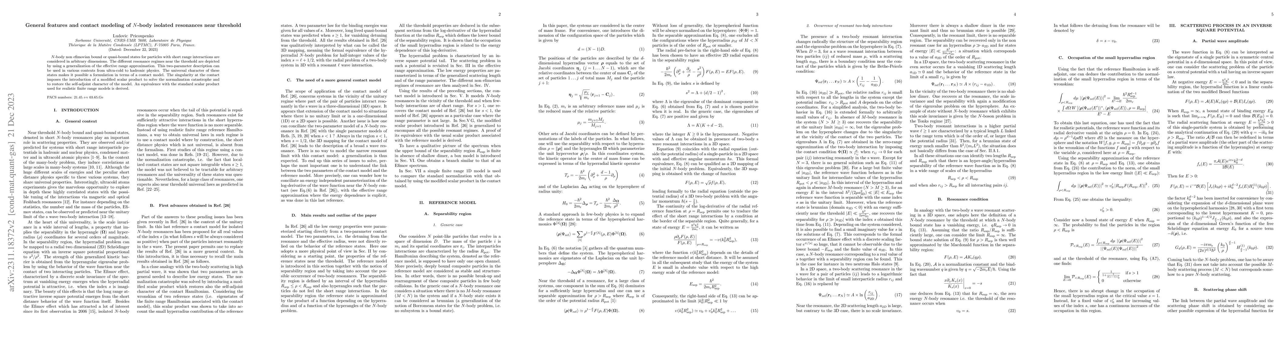 This paper explores $N$-body resonances near threshold in systems with short-range interactions, employing a generalized effective range approximation. It introduces a universal contact model to describe these states, addressing the normalization catastrophe through a modified scalar product and establishing equivalence with standard finite range models.