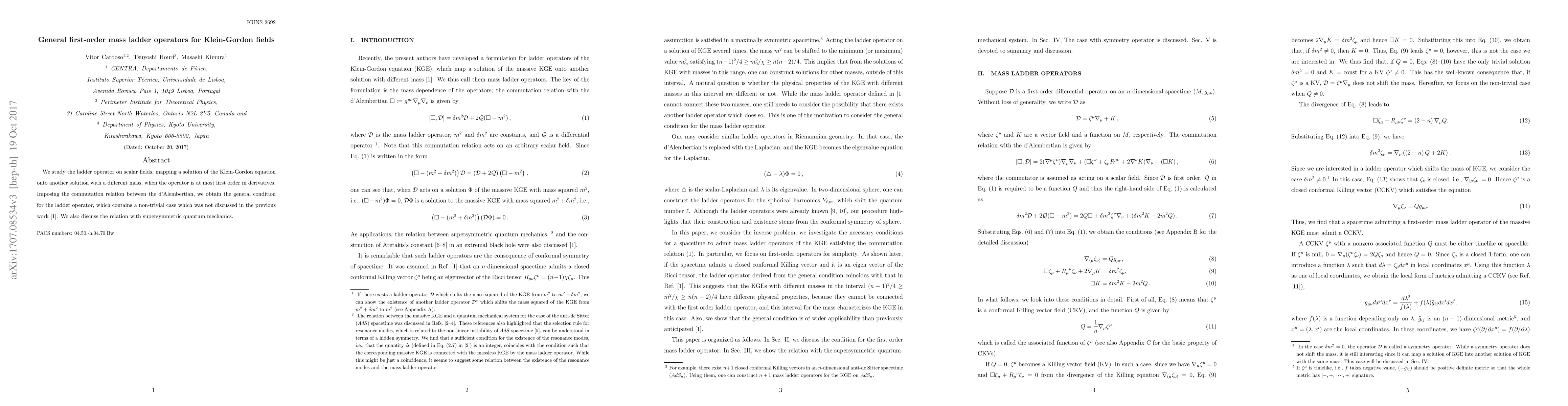We study the ladder operator on scalar fields, mapping a solution of the Klein-Gordon equation onto another solution with a different mass, when the operator is at most first order in derivatives. Imposing the commutation relation between the d'Alembertian, we obtain the general condition for the ladder operator, which contains a non-trivial case which was not discussed in the previous work [V. Cardoso, T. Houri and M. Kimura, Phys.Rev.D 96, 024044 (2017), arXiv:1706.07339]. We also discuss the relation with supersymmetric quantum mechanics.