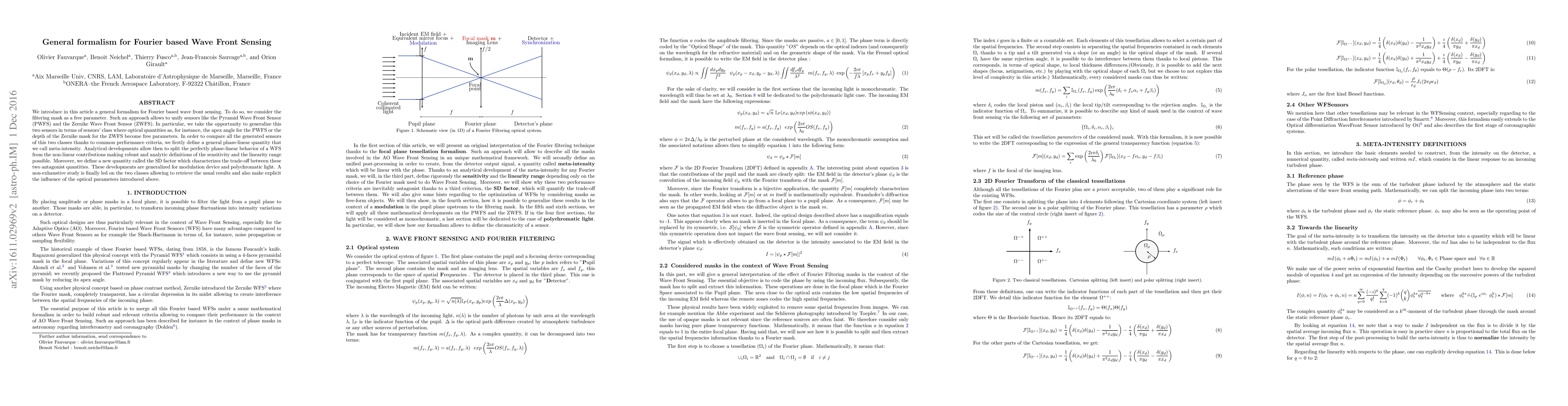 We introduce in this article a general formalism for Fourier based wave front sensing. To do so, we consider the filtering mask as a free parameter. Such an approach allows to unify sensors like the Pyramid Wave Front Sensor (PWFS) and the Zernike Wave Front Sensor (ZWFS). In particular, we take the opportunity to generalize this two sensors in terms of sensors' class where optical quantities as, for instance, the apex angle for the PWFS or the depth of the Zernike mask for the ZWFS become free parameters. In order to compare all the generated sensors of this two classes thanks to common performance criteria, we firstly define a general phase-linear quantity that we call meta-intensity. Analytical developments allow then to split the perfectly phase-linear behavior of a WFS from the non-linear contributions making robust and analytic definitions of the sensitivity and the linearity range possible. Moreover, we define a new quantity called the SD factor which characterizes the trade-off between these two antagonist quantities. These developments are generalized for modulation device and polychromatic light. A non-exhaustive study is finally led on the two classes allowing to retrieve the usual results and also make explicit the influence of the optical parameters introduced above.