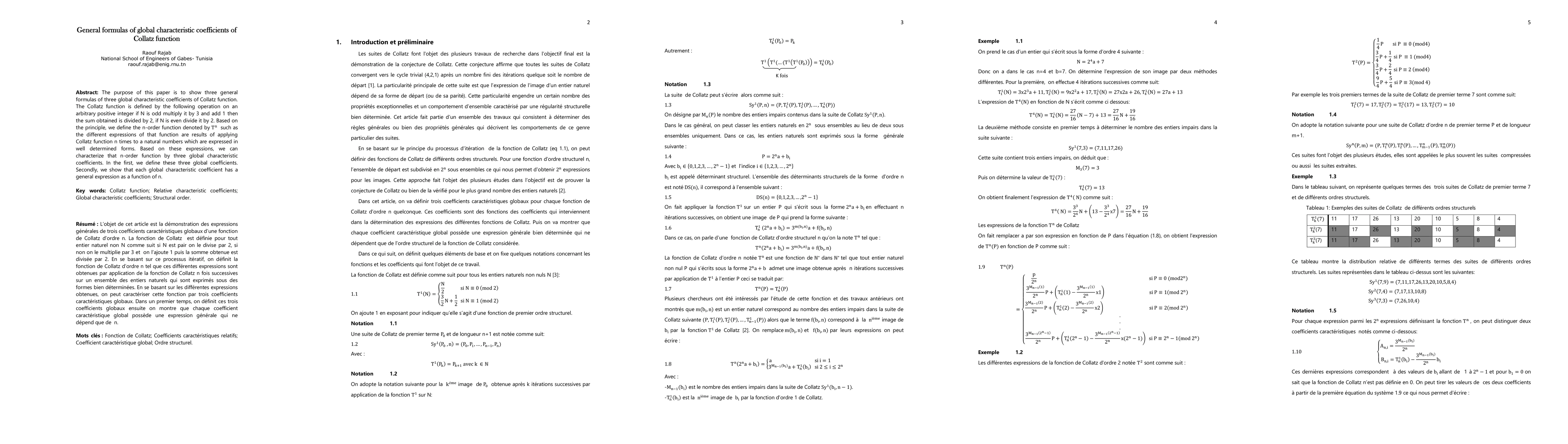 The purpose of this paper is to show three general formulas of three global characteristic coefficients of Collatz function. The Collatz function is defined by the following operation on an arbitrary positive integer if N is odd multiply it by 3 and add 1 then the sum obtained is divided by 2, if N is even divide it by 2. Based on the principle, we define the n-order function denoted by T^n such as the different expressions of that function are results of applying Collatz function n times to a natural numbers which are expressed in well determined forms. Based on these expressions, we can characterize that n-order function by three global characteristic coefficients. In the first, we define these three global coefficients. Secondly, we show that each global characteristic coefficient has a general expression as a function of n.