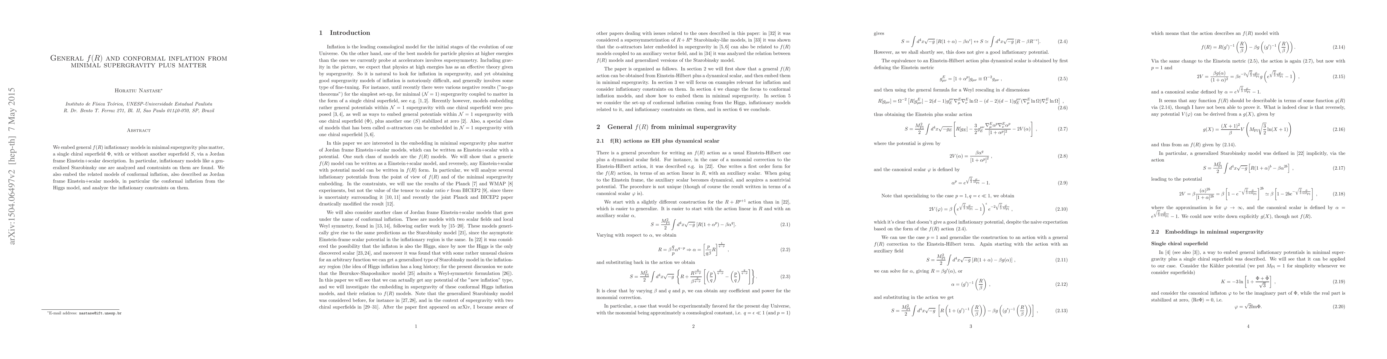 This paper investigates general $f(R)$ inflationary models within minimal supergravity plus matter, specifically through a single chiral superfield $\Phi$, potentially with an additional superfield $S$, in a Jordan frame. It analyzes inflationary constraints on generalized Starobinsky models and related conformal inflation models, such as those from the Higgs field.