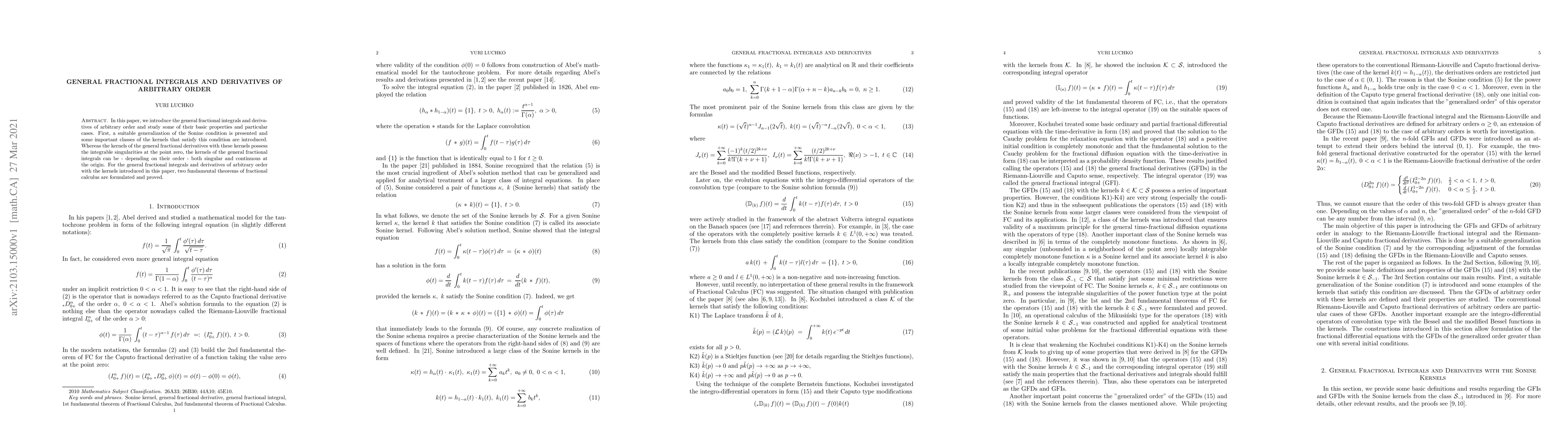 This paper introduces general fractional integrals and derivatives of arbitrary order, explores their properties, and presents a generalized Sonine condition for kernel classes. It formulates and proves two fundamental theorems for these integrals and derivatives, highlighting the different behaviors of their kernels at the origin.
