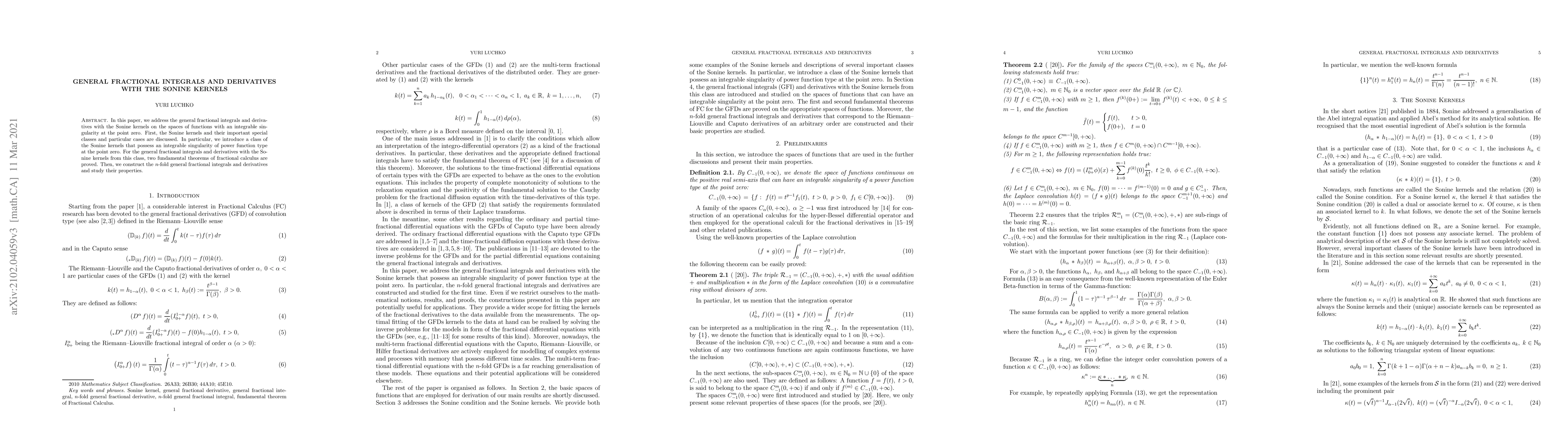 This paper explores general fractional integrals and derivatives using Sonine kernels, focusing on functions with integrable singularities at zero. It introduces a new class of Sonine kernels with power-type singularities and proves fundamental theorems for these kernels, followed by a study of the properties of $n$-fold general fractional integrals and derivatives.