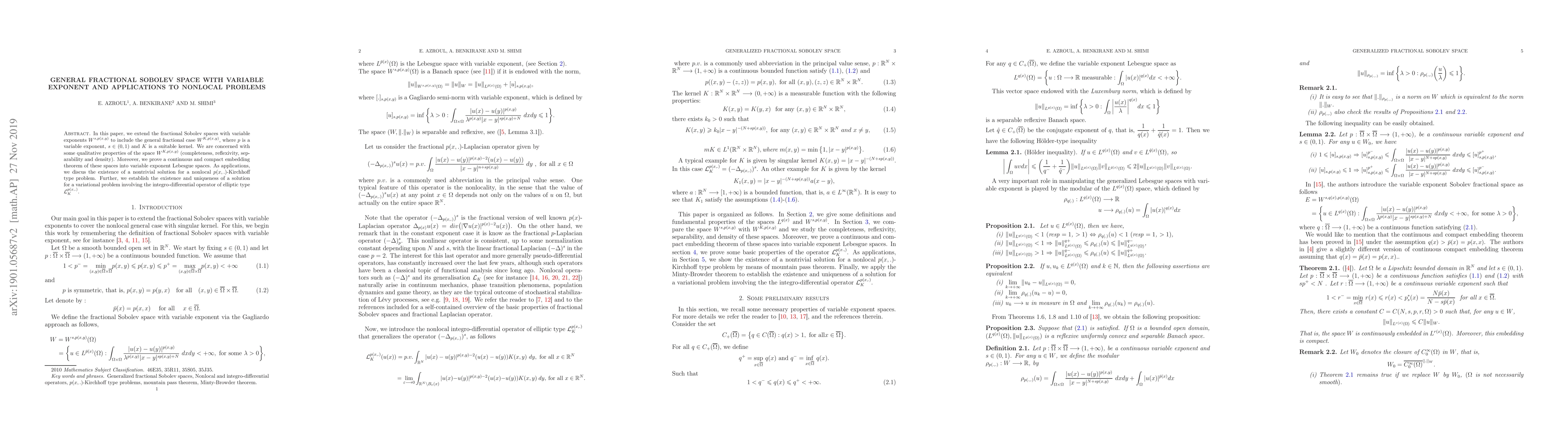 This paper extends the fractional Sobolev spaces with variable exponents to the general fractional case, examining properties like completeness and compactness. It also applies these spaces to prove the existence of solutions for nonlocal $p(x,.)$-Kirchhoff type problems and variational problems involving elliptic integro-differential operators.