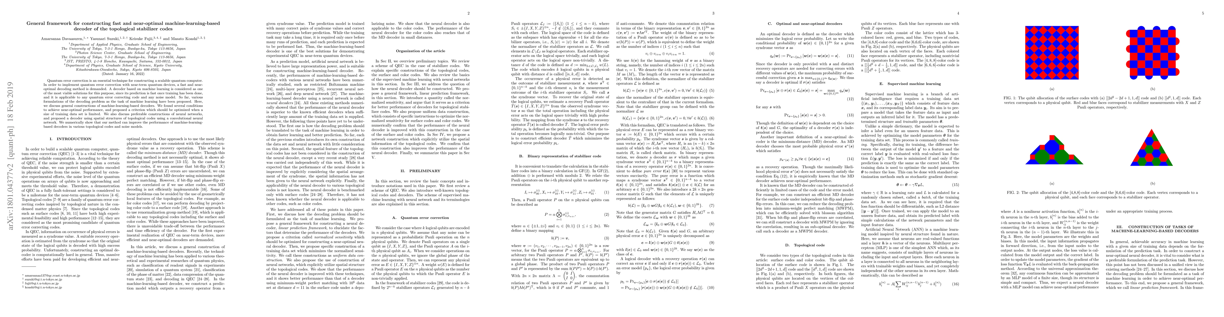 This paper presents a general framework for constructing fast and near-optimal machine-learning-based decoders for topological stabilizer codes, emphasizing the importance of neural network design and optimization criteria for limited training data. The proposed convolutional neural network decoder leverages spatial structures of topological codes to enhance performance across various codes and noise models.