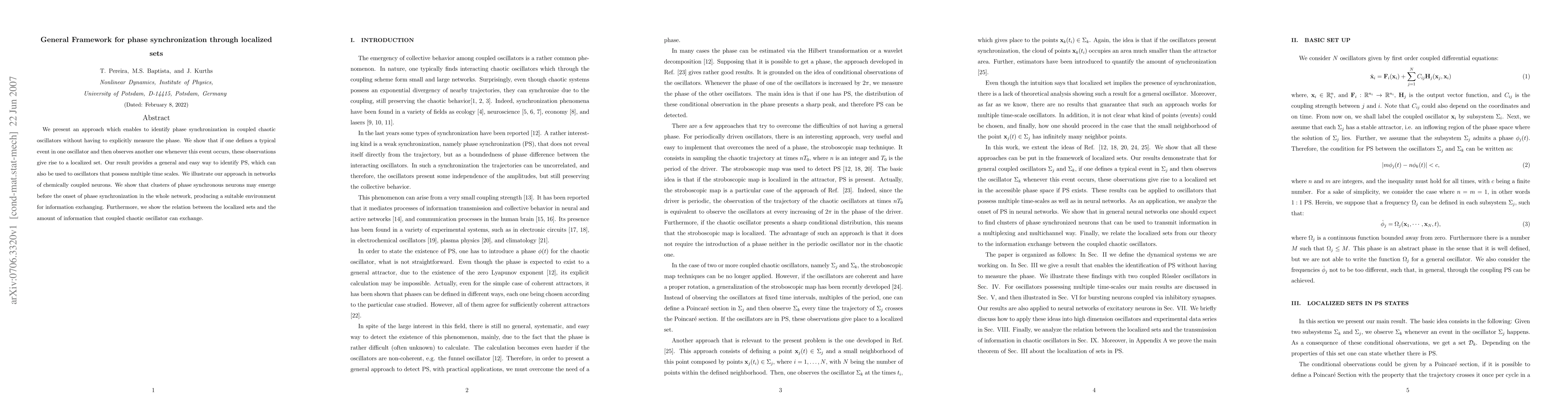 The paper introduces a general framework for detecting PS through localized sets, offering a novel method that does not require explicit phase calculation, applicable to both coherent and non-coherent chaotic oscillators.
