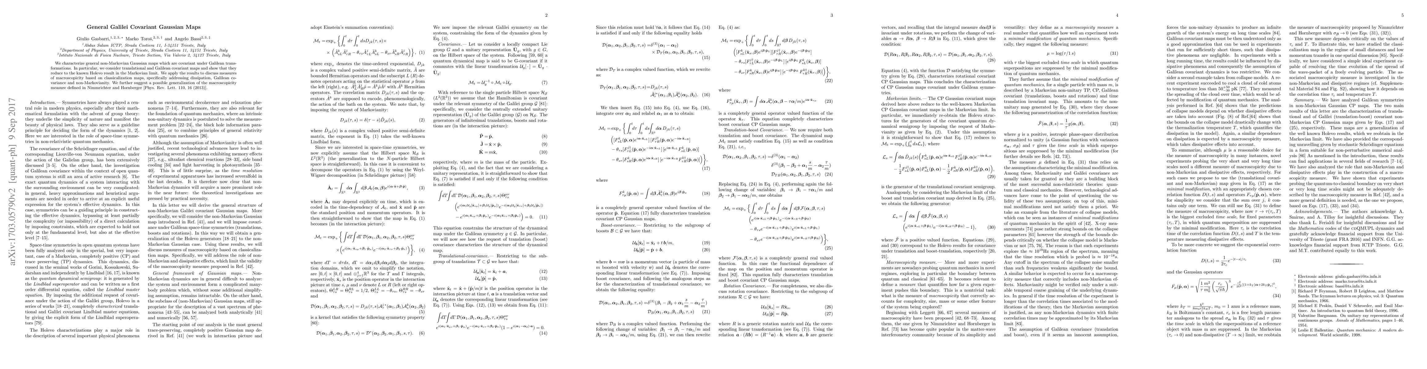 We characterize general non-Markovian Gaussian maps which are covariant under Galilean transformations. In particular, we characterize translational and Galilean covariant maps and show that they reduce to the known Holevo result in the Markovian limit. We apply the results to discuss measures of macroscopicity based on classicalization maps, specifically addressing dissipation, Galilean covariance and non-Markovianity. We further suggest a possible generalization of the macroscopicity measure defined in Nimmrichter and Hornbergerl. [Phys. Rev. Lett. 110, 16 (2013)].