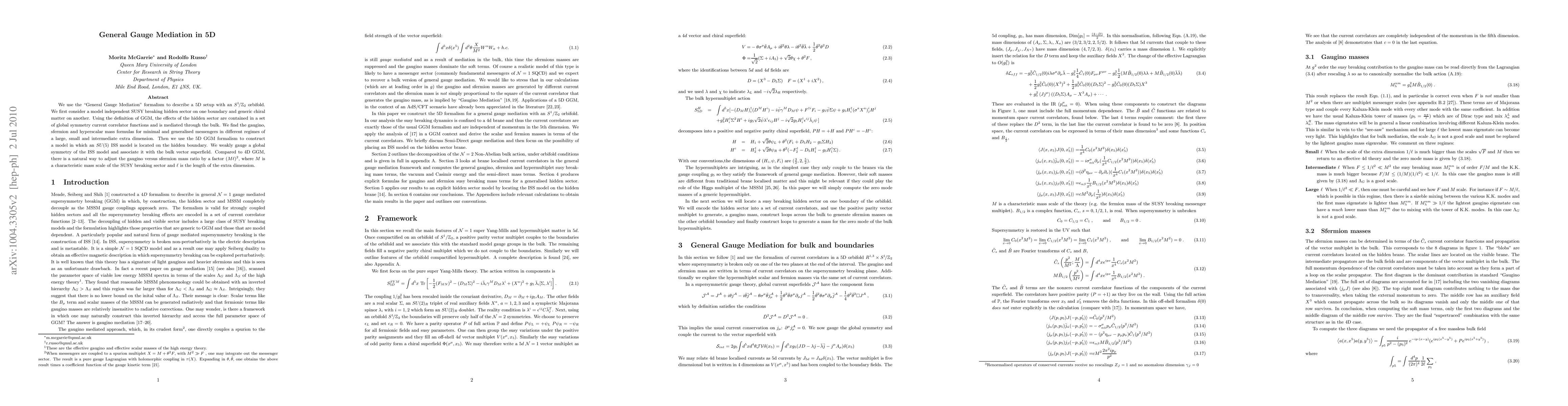 We use the "General Gauge Mediation" formalism to describe a 5D setup with an $S^{1}/Z_{2}$ orbifold. We first consider a model independent SUSY breaking hidden sector on one boundary and generic chiral matter on another. Using the definition of GGM, the effects of the hidden sector are contained in a set of global symmetry current correlator functions and is mediated through the bulk. We find the gaugino, sfermion and hyperscalar mass formulas for minimal and generalised messengers in different regimes of a large, small and intermediate extra dimension. Then we use the 5D GGM formalism to construct a model in which an SU(5) ISS model is located on the hidden boundary. We weakly gauge a global symmetry of the ISS model and associate it with the bulk vector superfield. Compared to 4D GGM, there is a natural way to adjust the gaugino versus sfermion mass ratio by a factor $(M l)^{2}$, where M is a characteristic mass scale of the SUSY breaking sector and l is the length of the extra dimension.