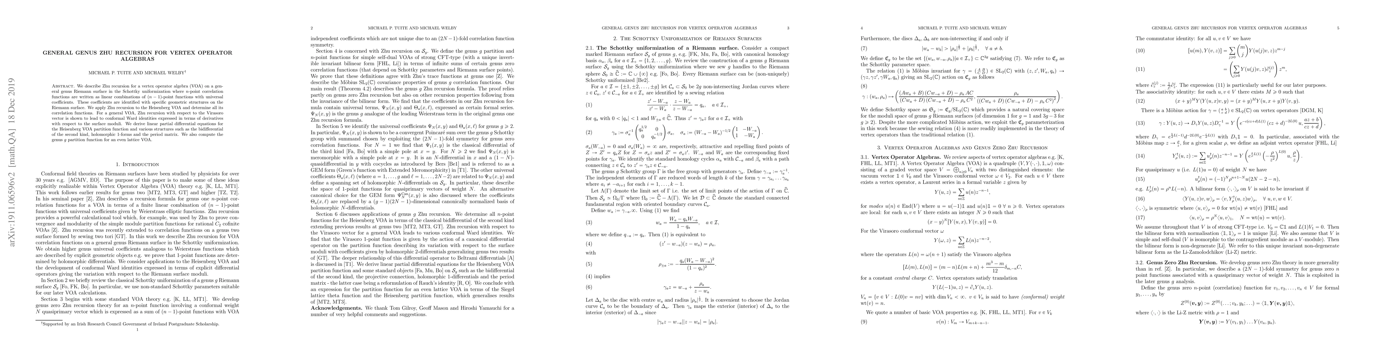 We describe Zhu recursion for a vertex operator algebra (VOA) on a general genus Riemann surface in the Schottky uniformization where $n$-point correlation functions are written as linear combinations of $(n-1)$-point functions with universal coefficients. These coefficients are identified with specific geometric structures on the Riemann surface. We apply Zhu recursion to the Heisenberg VOA and determine all its correlation functions. For a general VOA, Zhu recursion with respect to the Virasoro vector is shown to lead to conformal Ward identities expressed in terms of derivatives with respect to the surface moduli. We derive linear partial differential equations for the Heisenberg VOA partition function and various structures such as the bidifferential of the second kind, holomorphic 1-forms and the period matrix. We also compute the genus $g$ partition function for an even lattice VOA.