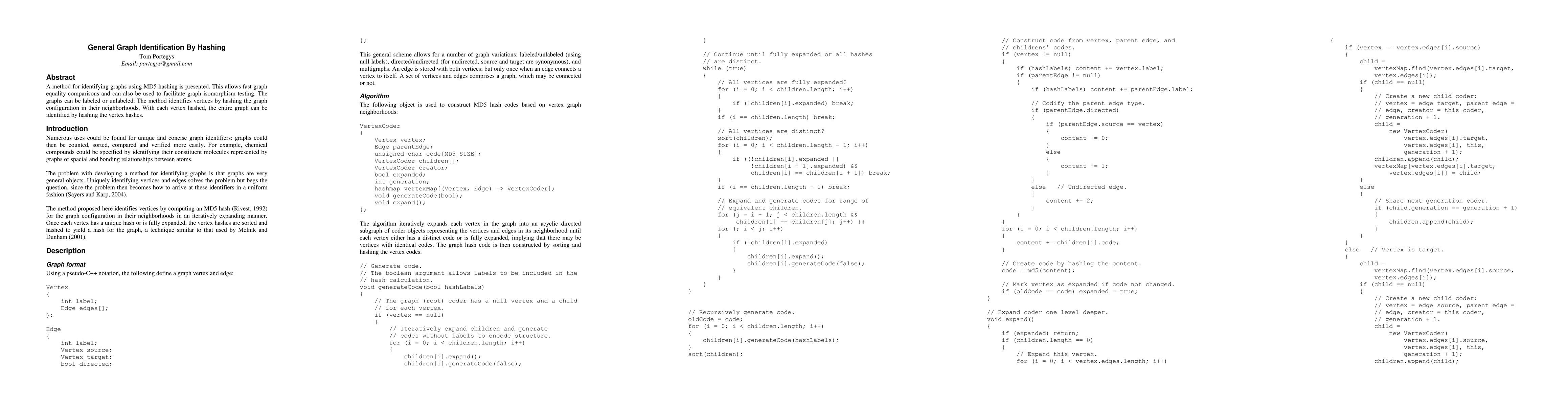 A method for identifying graphs using MD5 hashing is presented. This allows fast graph equality comparisons and can also be used to facilitate graph isomorphism testing. The graphs can be labeled or unlabeled. The method identifies vertices by hashing the graph configuration in their neighborhoods. With each vertex hashed, the entire graph can be identified by hashing the vertex hashes.