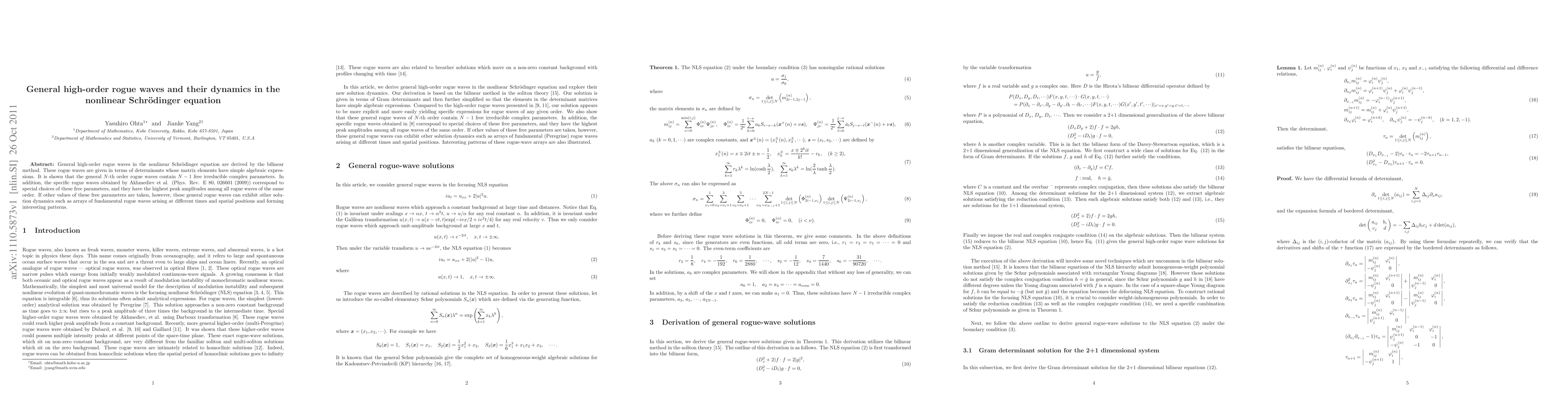This paper derives general high-order rogue waves in the nonlinear Schrödinger equation using the bilinear method, showing that they contain N-1 free irreducible complex parameters. The specific rogue waves by Akhmediev et al. correspond to special parameter choices with the highest peak amplitudes, while other parameter values lead to different dynamics, including arrays of rogue waves forming intriguing patterns.