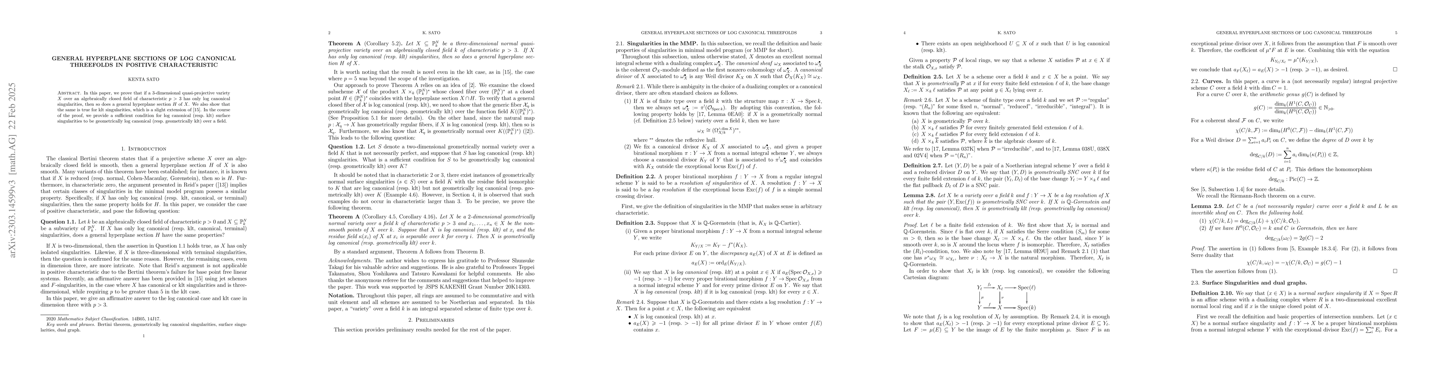 This paper demonstrates that for a $3$-dimensional quasi-projective variety $X$ with log canonical or klt singularities over a field of characteristic $p>3$, a general hyperplane section $H$ retains these singularity types. It also establishes a condition for surface singularities to remain geometrically log canonical or klt over the field.