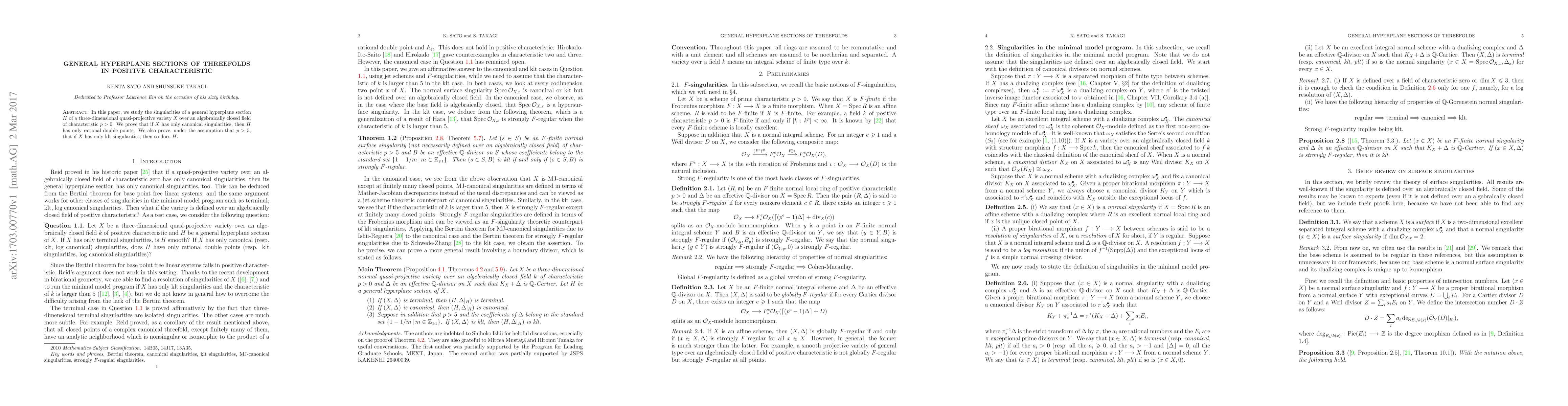 In this paper, we study the singularities of a general hyperplane section $H$ of a three-dimensional quasi-projective variety $X$ over an algebraically closed field of characteristic $p>0$. We prove that if $X$ has only canonical singularities, then $H$ has only rational double points. We also prove, under the assumption that $p>5$, that if $X$ has only klt singularities, then so does $H$.