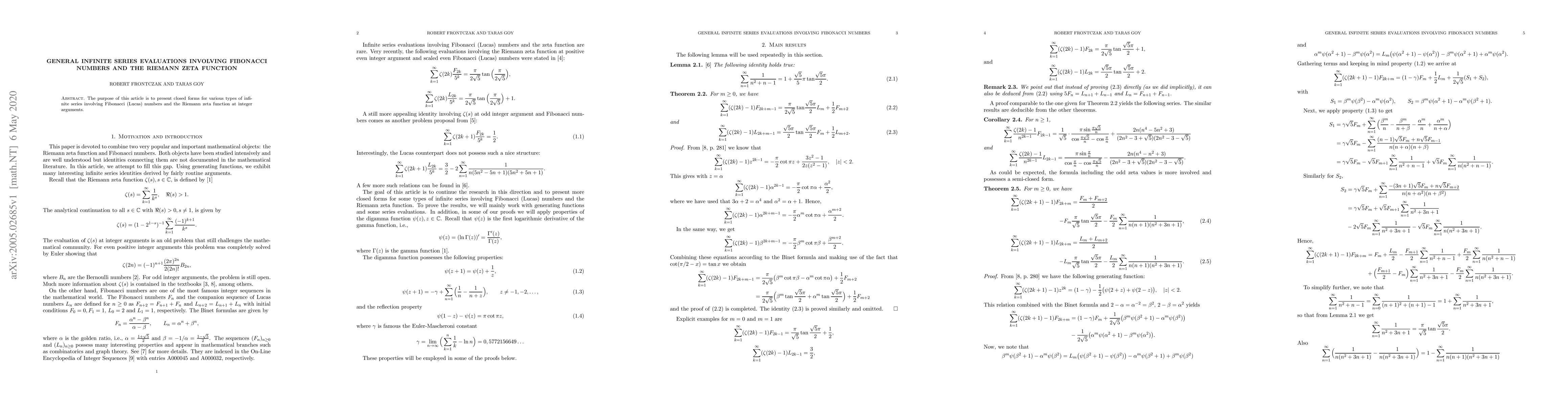 Summary: This paper provides closed-form expressions for diverse infinite series that combine Fibonacci and Lucas numbers with the Riemann Zeta function evaluated at integer points. The results offer new insights into the interplay between these mathematical sequences.