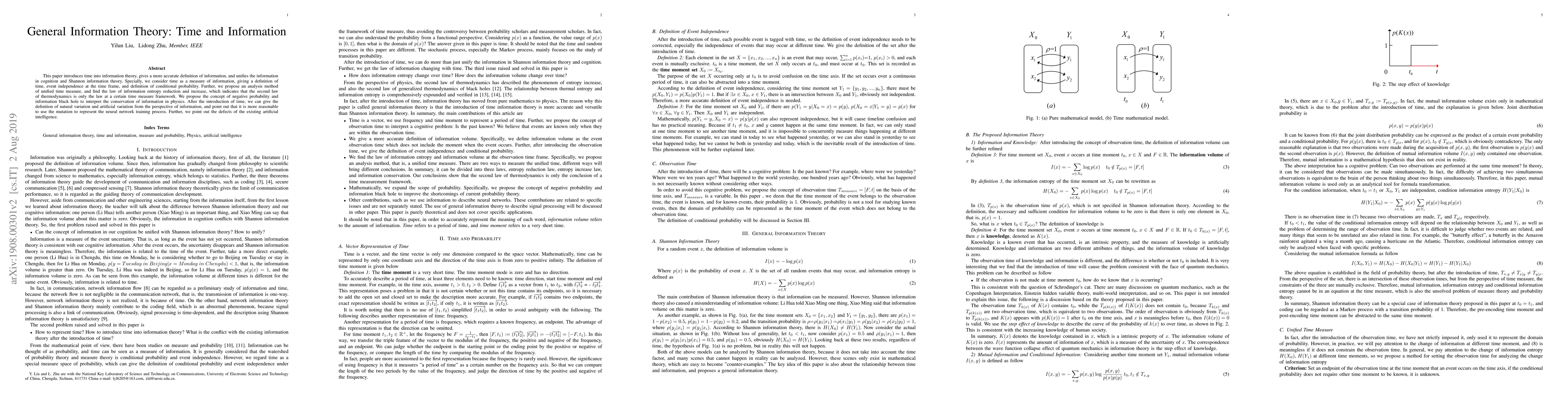 This paper introduces time into information theory, proposing a unified framework that reconciles cognitive and Shannon information theories. It also explores concepts like negative probability, information black holes, and mutation as a model for neural network training.