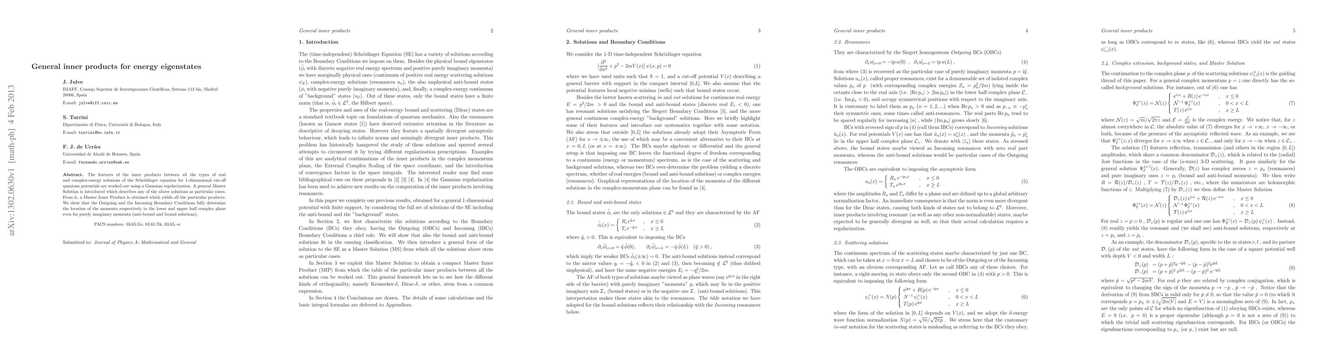This paper explores inner products for various energy eigenstates in 1-dimensional quantum potentials using Gaussian regularization, introducing a Master Solution and a Master Inner Product that encompass all types of solutions. It demonstrates that boundary conditions dictate the momentum locations in the complex plane, even for purely imaginary momenta.