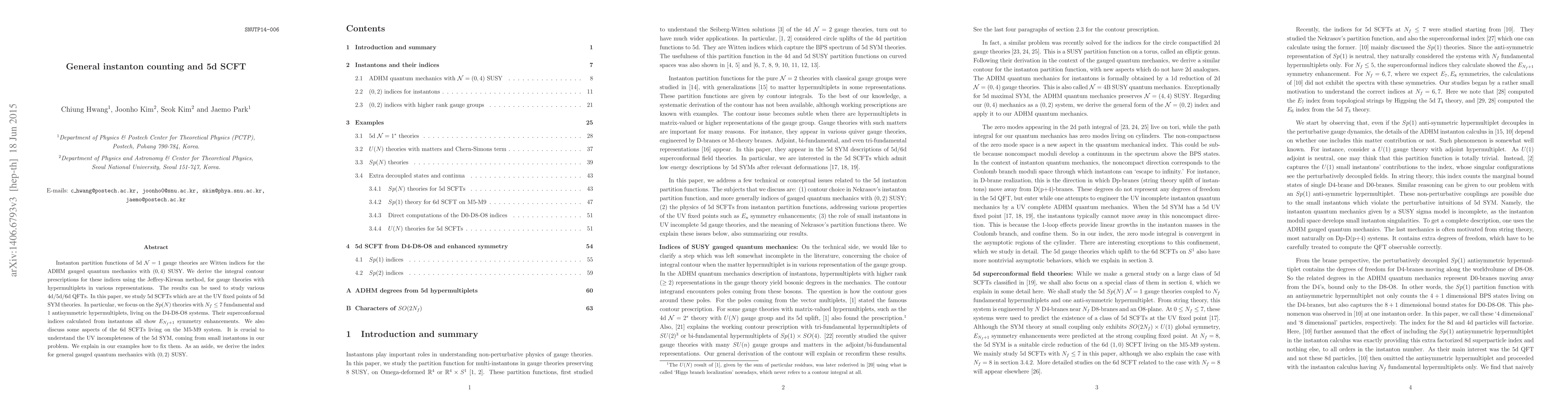 Instanton partition functions of 5d N=1 gauge theories are Witten indices for the ADHM gauged quantum mechanics with (0,4) SUSY. We derive the integral contour prescriptions for these indices using the Jeffrey-Kirwan method, for gauge theories with hypermultiplets in various representations. The results can be used to study various 4d/5d/6d QFTs. In this paper, we study 5d SCFTs which are at the UV fixed points of 5d SYM theories. In particular, we focus on the Sp(N) theories with N_f \leq 7 fundamental and 1 antisymmetric hypermultiplets, living on the D4-D8-O8 systems. Their superconformal indices calculated from instantons all show E_{N_f+1} symmetry enhancements. We also discuss some aspects of the 6d SCFTs living on the M5-M9 system. It is crucial to understand the UV incompleteness of the 5d SYM, coming from small instantons in our problem. We explain in our examples how to fix them. As an aside, we derive the index for general gauged quantum mechanics with (0,2) SUSY.