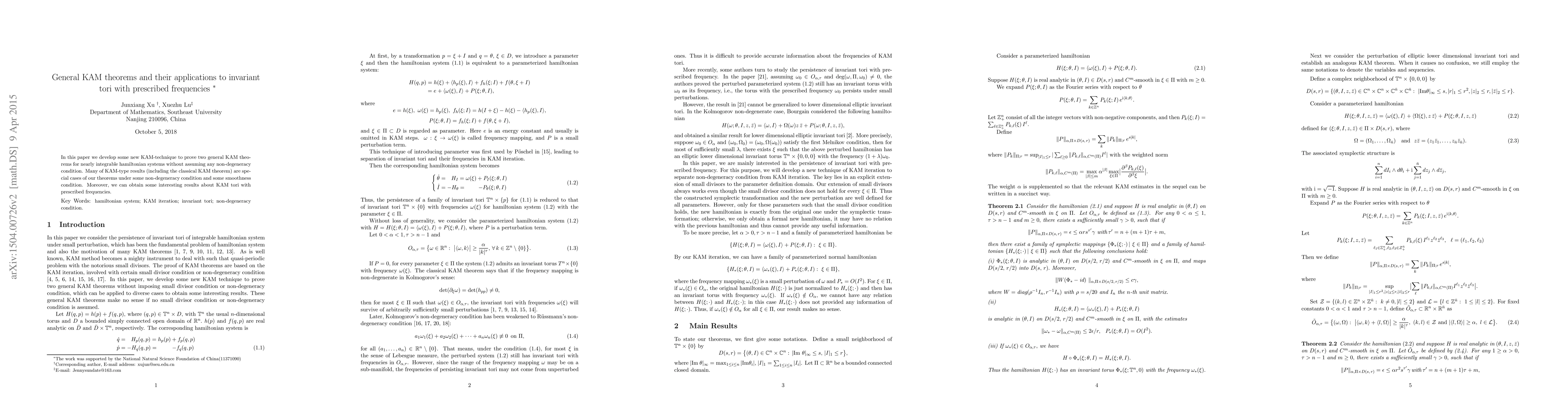 This paper introduces novel KAM techniques to establish two general KAM theorems for nearly integrable Hamiltonian systems without requiring non-degeneracy conditions. It also explores KAM tori with prescribed frequencies, extending classical KAM results under specific conditions.