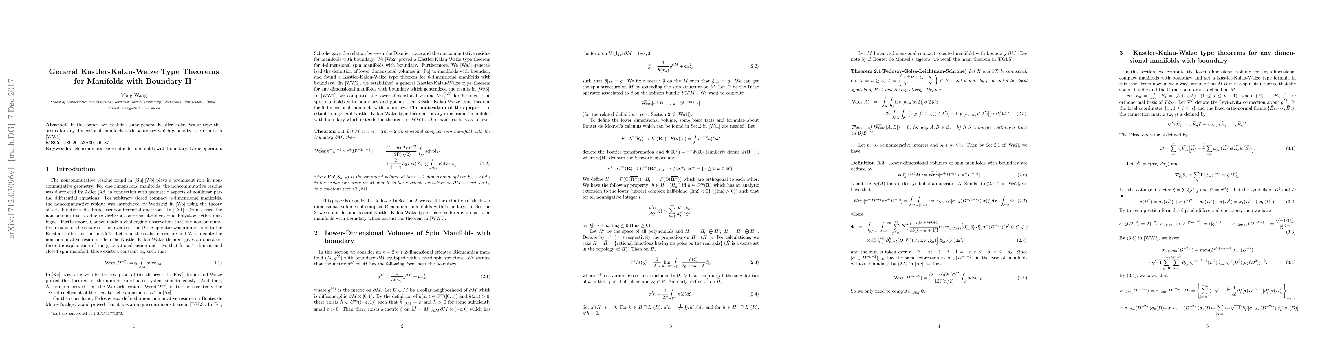 This paper extends general Kastler-Kalau-Walze theorems to any dimensional manifolds with boundary, broadening the scope beyond previously studied results. The work aims to provide new insights into the behavior of these theorems in more complex geometries.