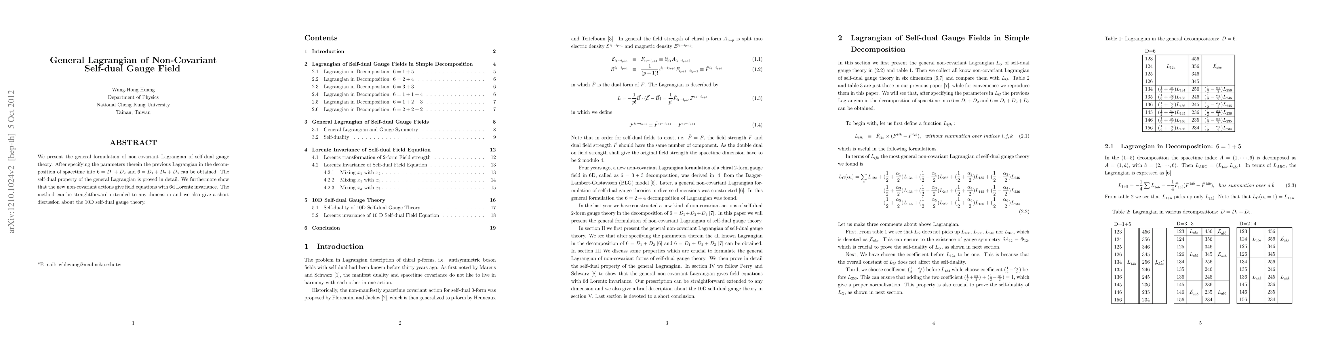 We present the general formulation of non-covariant Lagrangian of self-dual gauge theory. After specifying the parameters therein the previous Lagrangian in the decomposition of spacetime into $6=D_1+D_2$ and $6=D_1+D_2+D_3$ can be obtained. The self-dual property of the general Lagrangian is proved in detail. We furthermore show that the new non-covariant actions give field equations with 6d Lorentz invariance. The method can be straightforward extended to any dimension and we also give a short discussion about the 10D self-dual gauge theory.