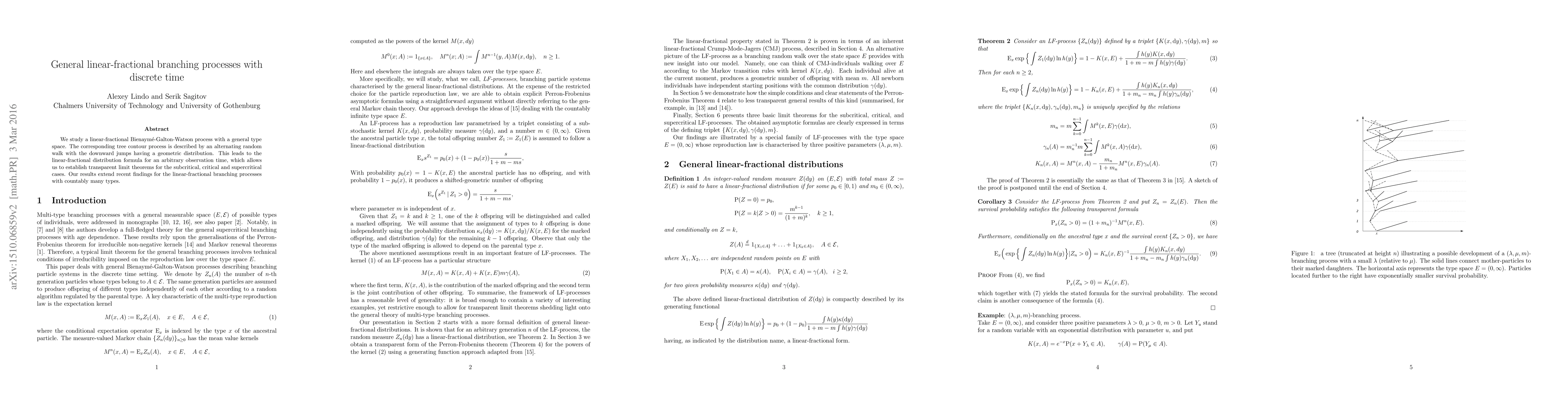 We study a linear-fractional Bienaym\'e-Galton-Watson process with a general type space. The corresponding tree contour process is described by an alternating random walk with the downward jumps having a geometric distribution. This leads to the linear-fractional distribution formula for an arbitrary observation time, which allows us to establish transparent limit theorems for the subcritical, critical and supercritical cases. Our results extend recent findings for the linear-fractional branching processes with countably many types.