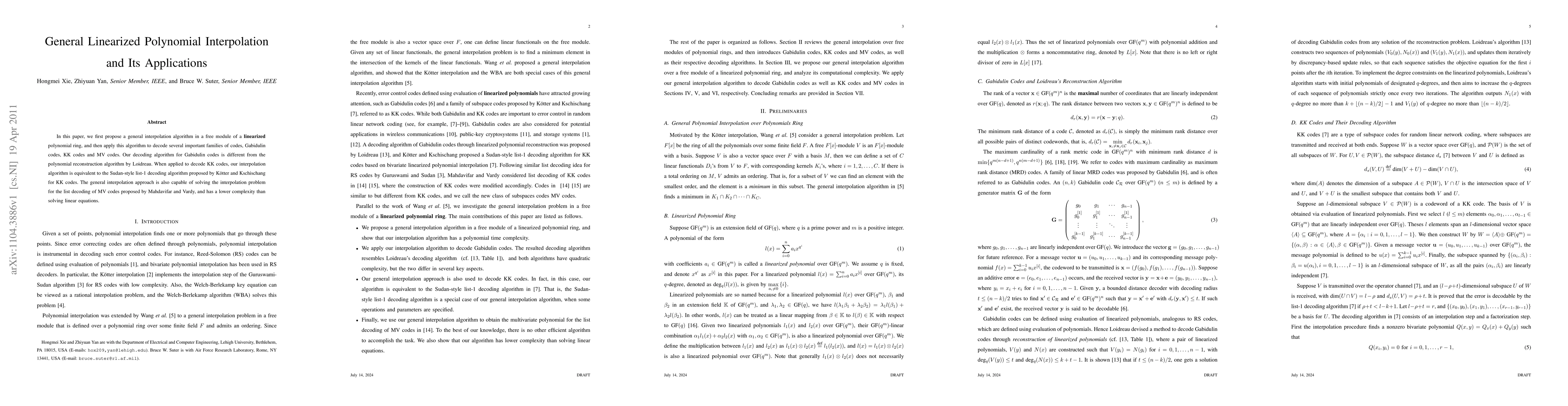 This paper proposes a general linearized polynomial interpolation algorithm for decoding several types of error-correcting codes, including Gabidulin codes and MV codes, with potential benefits over existing decoding methods.