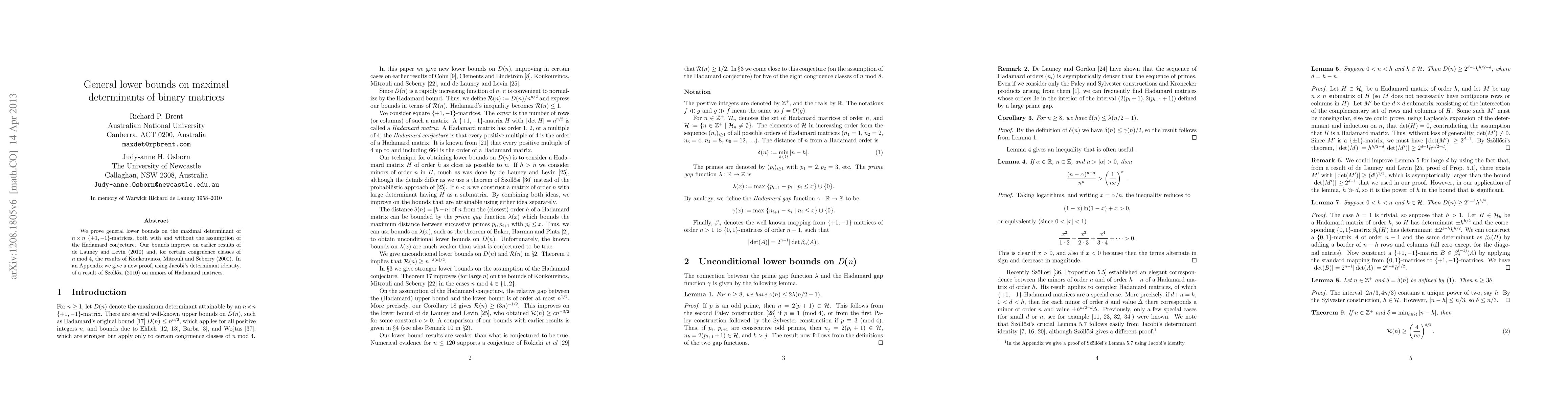 This paper establishes improved general lower bounds for the maximal determinant of n by n binary matrices (+1,-1) with and without the Hadamard conjecture, surpassing previous results. An appendix provides a new proof of Szőllősi's result on minors of Hadamard matrices using Jacobi's determinant identity.