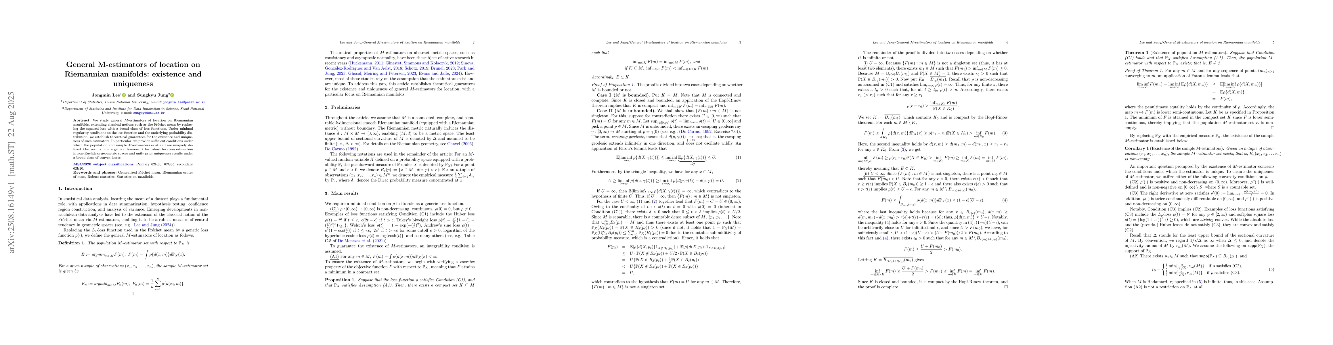 We study general M-estimators of location on Riemannian manifolds, extending classical notions such as the Frechet mean by replacing the squared loss with a broad class of loss functions. Under minimal regularity conditions on the loss function and the underlying probability distribution, we establish theoretical guarantees for the existence and uniqueness of such estimators. In particular, we provide sufficient conditions under which the population and sample M-estimators exist and are uniquely defined. Our results offer a general framework for robust location estimation in non-Euclidean geometric spaces and unify prior uniqueness results under a broad class of convex losses.