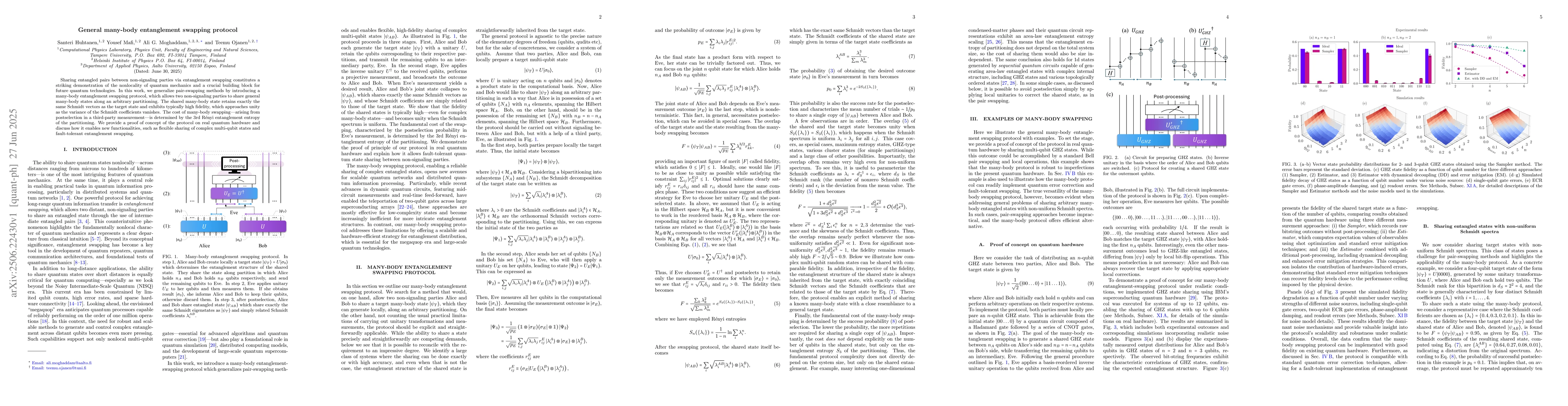 Sharing entangled pairs between non-signaling parties via entanglement swapping constitutes a striking demonstration of the nonlocality of quantum mechanics and a crucial building block for future quantum technologies. In this work, we generalize pair-swapping methods by introducing a many-body entanglement swapping protocol, which allows two non-signaling parties to share general many-body states along an arbitrary partitioning. The shared many-body state retains exactly the same Schmidt vectors as the target state and exhibits typically high fidelity, which approaches unity as the variance of the Schmidt coefficients vanishes. The cost of many-body swapping - arising from postselection in a third-party measurement - is determined by the 3rd R\'enyi entanglement entropy of the partitioning. We provide a proof of concept of the protocol on real quantum hardware and discuss how it enables new functionalities, such as flexible sharing of complex multi-qubit states and fault-tolerant entanglement swapping.