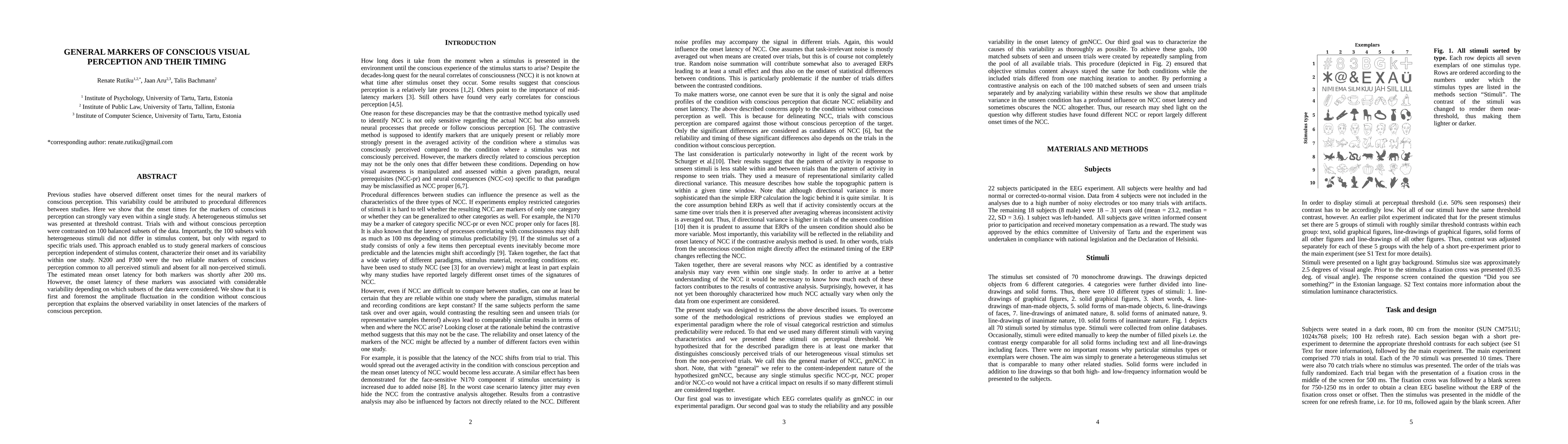 Researchers identified two markers of conscious visual perception, N200 and P300, with onset latencies of around 200ms, showing variability that can be explained by fluctuations in non-perceived stimuli data.
