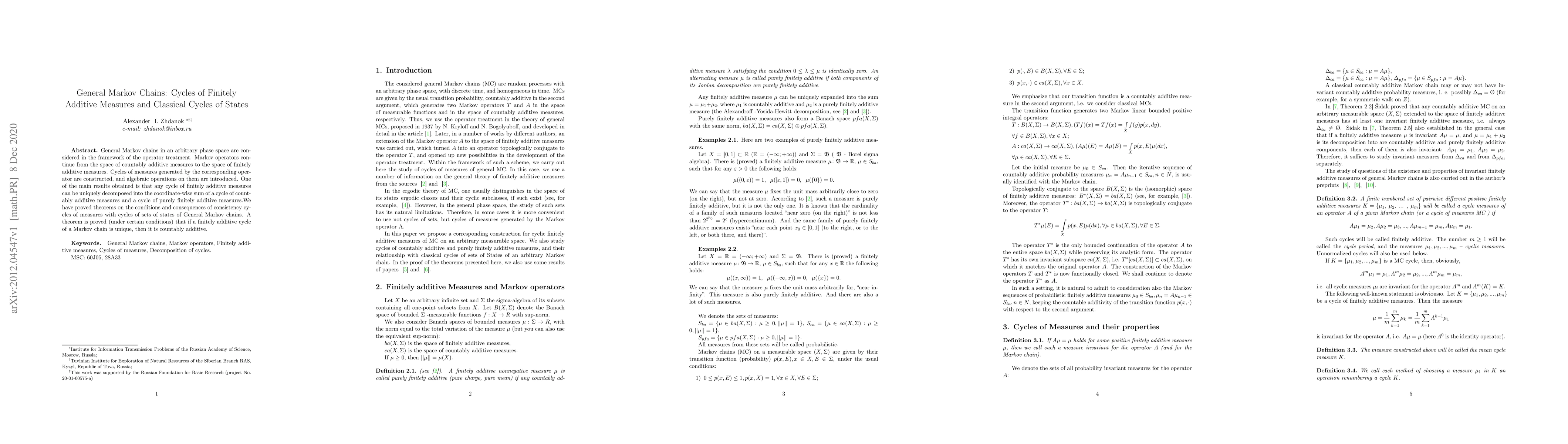 This paper explores general Markov chains using operator treatment, focusing on cycles of finitely additive measures. It demonstrates that any cycle of finitely additive measures can be decomposed into a sum of countably and purely finitely additive cycles, and proves conditions under which unique finitely additive cycles become countably additive.