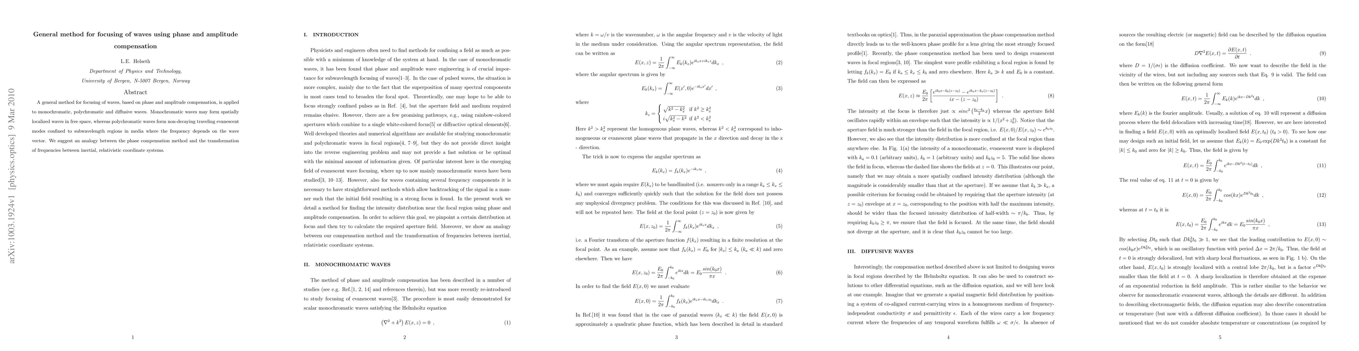 Summary: This paper presents a versatile method for focusing waves through phase and amplitude compensation, applicable to monochromatic, polychromatic, and diffusive waves. It highlights the formation of localized waves in free space and evanescent modes in media, drawing an analogy to frequency transformations in relativistic coordinates.