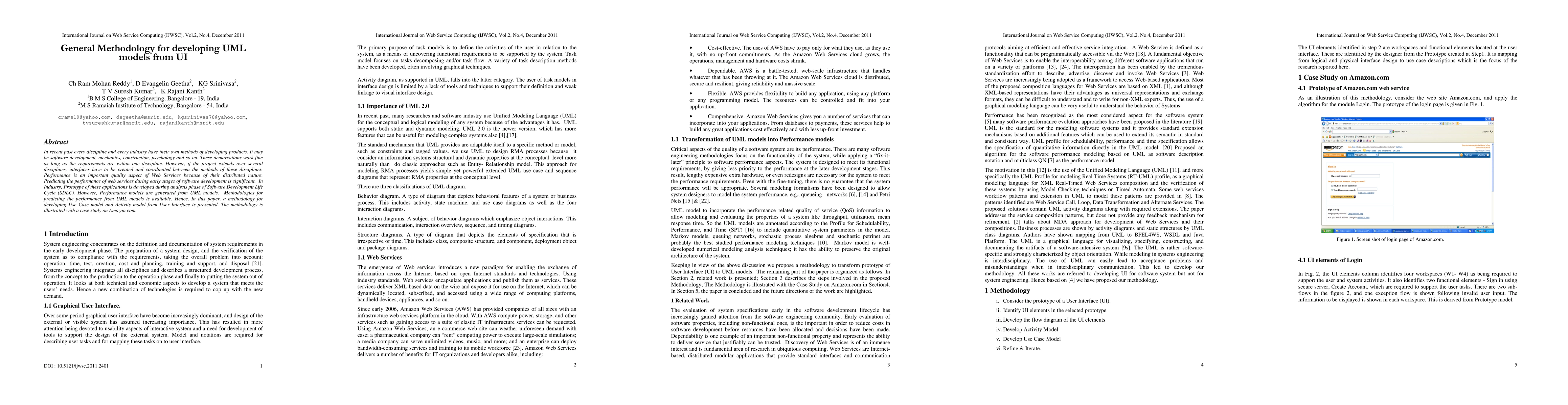 In recent past every discipline and every industry have their own methods of developing products. It may be software development, mechanics, construction, psychology and so on. These demarcations work fine as long as the requirements are within one discipline. However, if the project extends over several disciplines, interfaces have to be created and coordinated between the methods of these disciplines. Performance is an important quality aspect of Web Services because of their distributed nature. Predicting the performance of web services during early stages of software development is significant. In Industry, Prototype of these applications is developed during analysis phase of Software Development Life Cycle (SDLC). However, Performance models are generated from UML models. Methodologies for predicting the performance from UML models is available. Hence, In this paper, a methodology for developing Use Case model and Activity model from User Interface is presented. The methodology is illustrated with a case study on Amazon.com.