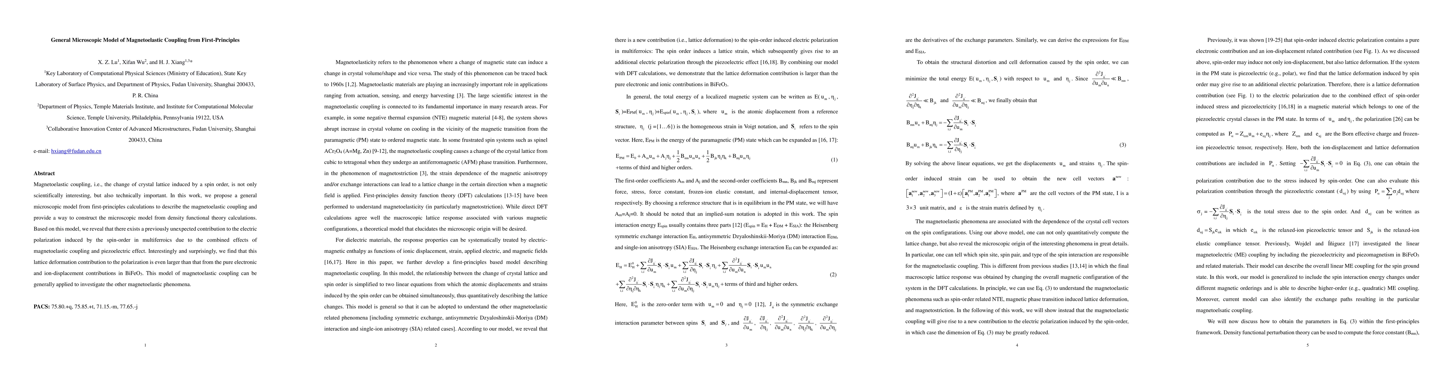 This paper proposes a general microscopic model from first-principles to describe magnetoelastic coupling, revealing an unexpected large contribution to electric polarization in multiferroics due to lattice deformation effects, which surpasses contributions from electronic and ion-displacement effects in BiFeO3. The model can be applied to study various magnetoelastic phenomena.