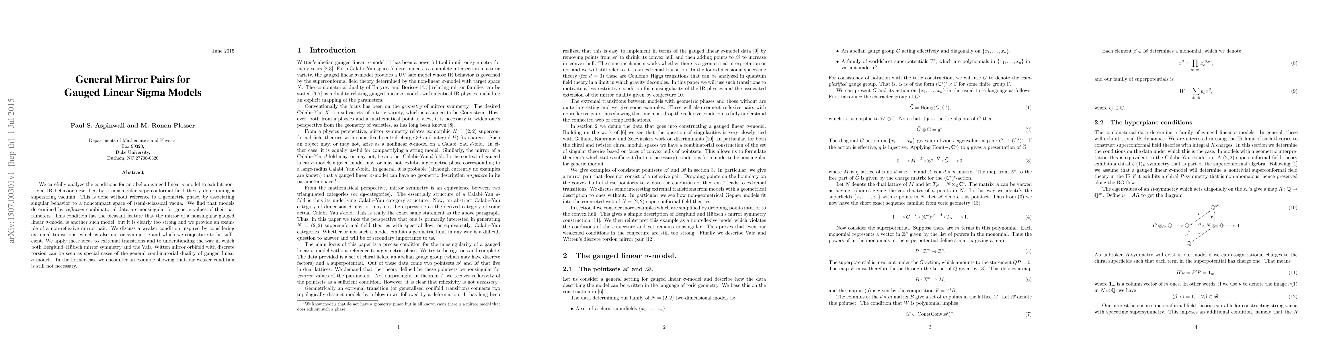 We carefully analyze the conditions for an abelian gauged linear sigma-model to exhibit nontrivial IR behavior described by a nonsingular superconformal field theory determining a superstring vacuum. This is done without reference to a geometric phase, by associating singular behavior to a noncompact space of (semi-)classical vacua. We find that models determined by reflexive combinatorial data are nonsingular for generic values of their parameters. This condition has the pleasant feature that the mirror of a nonsingular gauged linear sigma-model is another such model, but it is clearly too strong and we provide an example of a non-reflexive mirror pair. We discuss a weaker condition inspired by considering extremal transitions, which is also mirror symmetric and which we conjecture to be sufficient. We apply these ideas to extremal transitions and to understanding the way in which both Berglund-Hubsch mirror symmetry and the Vafa-Witten mirror orbifold with discrete torsion can be seen as special cases of the general combinatorial duality of GLSMs. In the former case we encounter an example showing that our weaker condition is still not necessary.