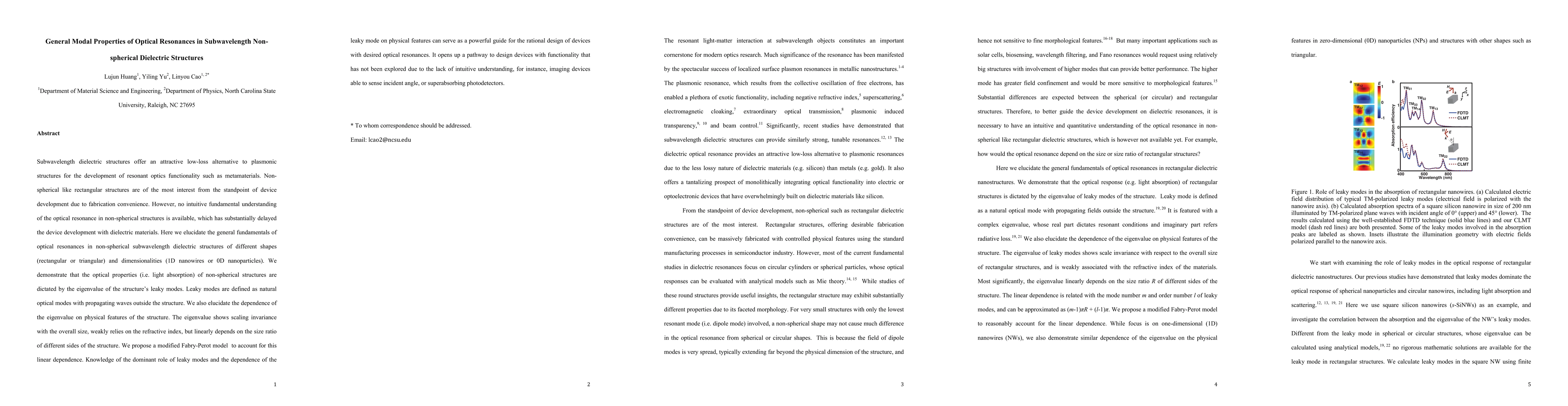This paper elucidates the fundamental optical resonances in nonspherical subwavelength dielectric structures, revealing that their light absorption properties are governed by the eigenvalue of their leaky modes. The study proposes a modified Fabry-Perot model to account for the linear dependence of these eigenvalues on structural size ratios, offering a guide for designing advanced optical devices.