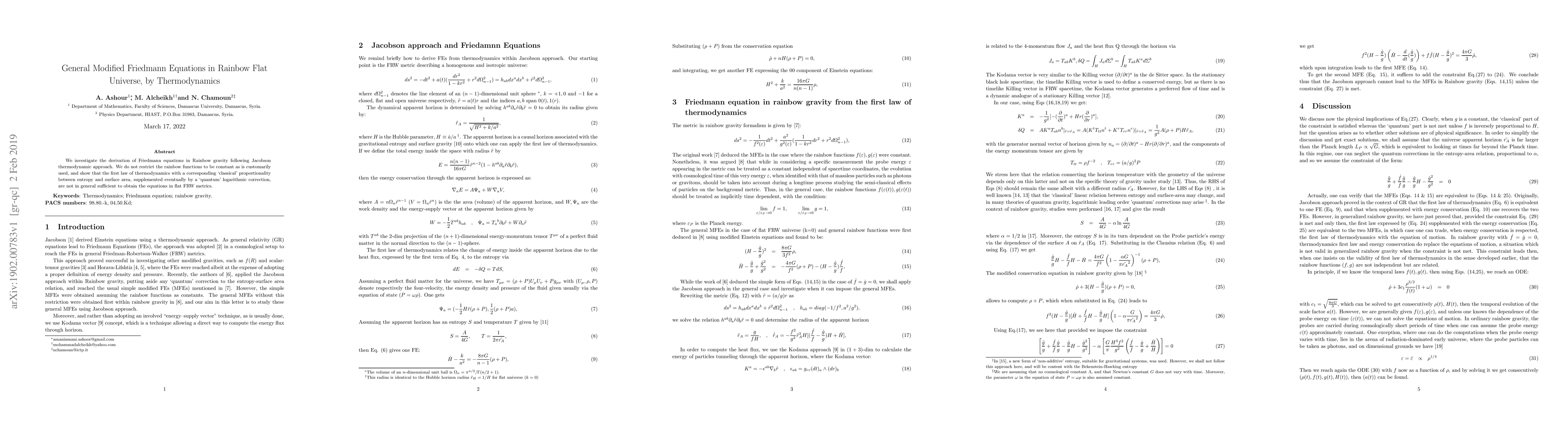 We investigate the derivation of Friedmann equations in Rainbow gravity following Jacobson thermodynamic approach. We do not restrict the rainbow functions to be constant as is customarily used, and show that the first law of thermodynamics with a corresponding `classical' proportionality between entropy and surface area, supplemented eventually by a `quantum' logarithmic correction, are not in general sufficient to obtain the equations in flat FRW metrics.