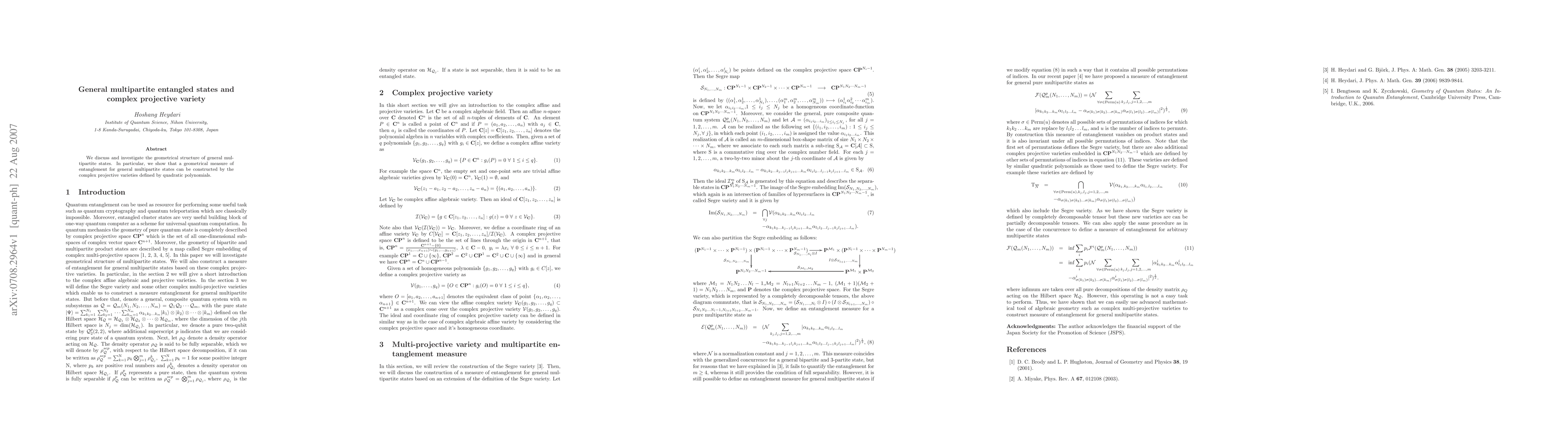 This paper explores the geometrical structure of general multipartite quantum states, demonstrating that a measure of entanglement can be constructed using complex projective varieties defined by quadratic polynomials. The findings provide a new perspective on the complexity of multipartite entanglement.