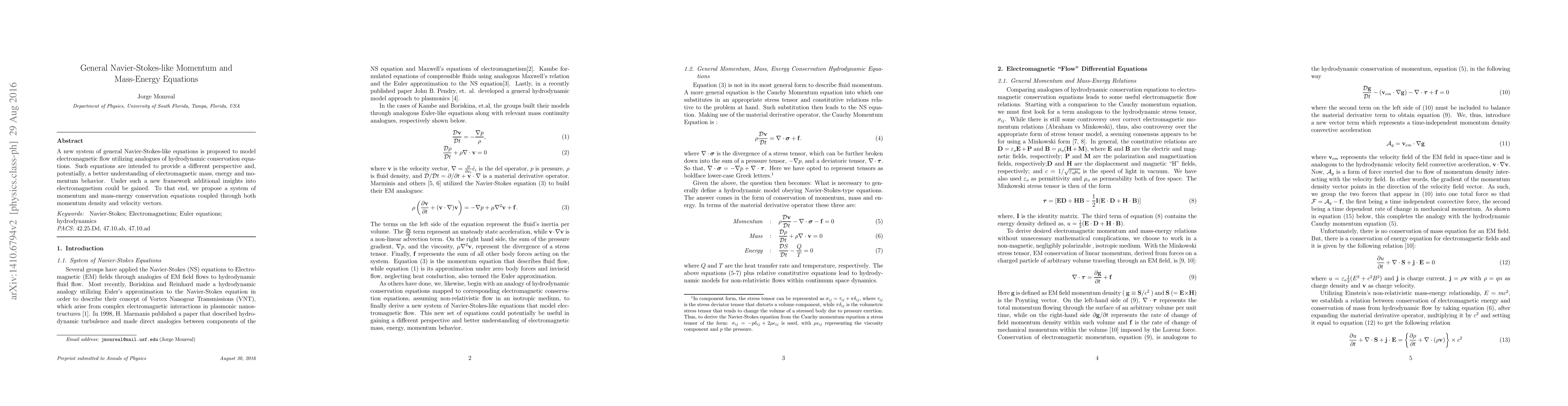 A new system of general Navier-Stokes-like equations is proposed to model electromagnetic analogous to hydrodynamic. While most attempts to derive analogues of hydrodynamic to electromagnetic, and vice-versa, start with Navier-Stokes or a Euler approximation, we propose general conservation equations as a starting point. Such equations provide a structured framework from which additional insights into the problem at hand could be obtained. To that end, we propose a system of momentum and mass-energy conservation equations coupled through both momentum density and velocity vectors.