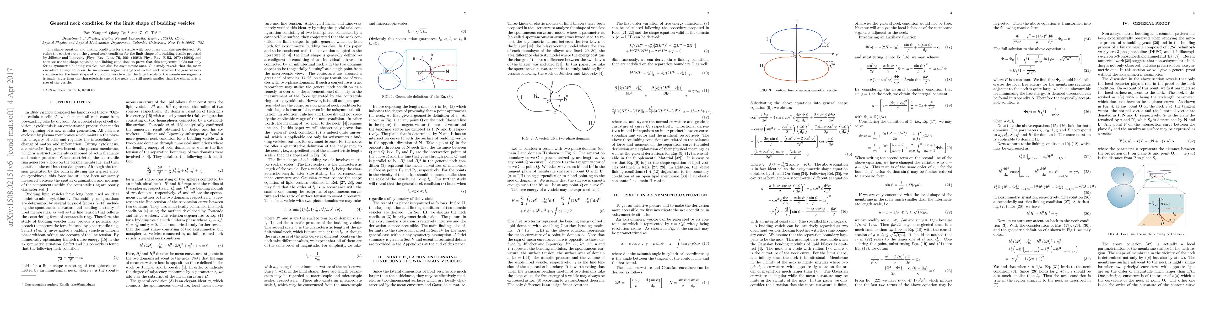 This paper refines and proves a conjecture regarding the general neck condition for the limit shape of budding vesicles, showing it applies to both symmetric and asymmetric vesicles. It derives the shape equation and linking conditions for vesicles with two-phase domains, confirming the condition holds when membrane segment lengths are larger than the neck size but smaller than the vesicle size.