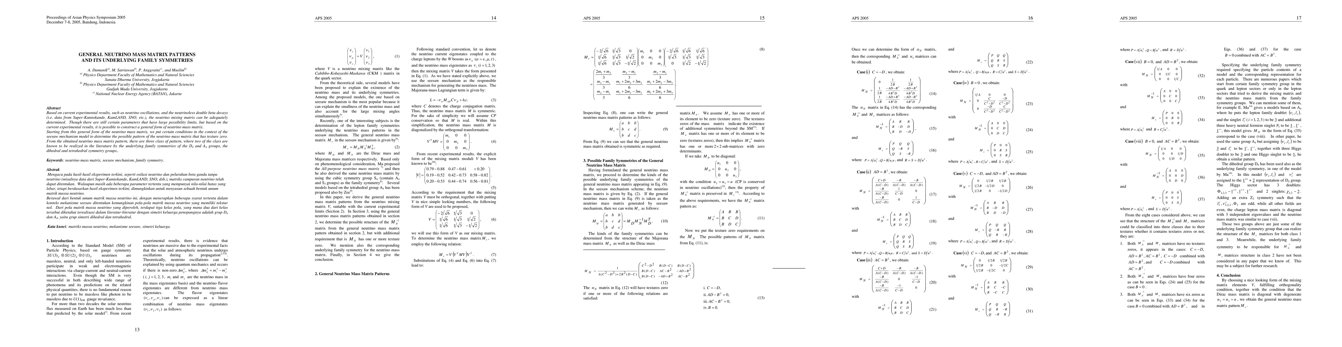 This paper derives general neutrino mass matrix patterns using current experimental data, identifying three classes with two recognized by $D_4$ and $A_4$ family symmetries.
