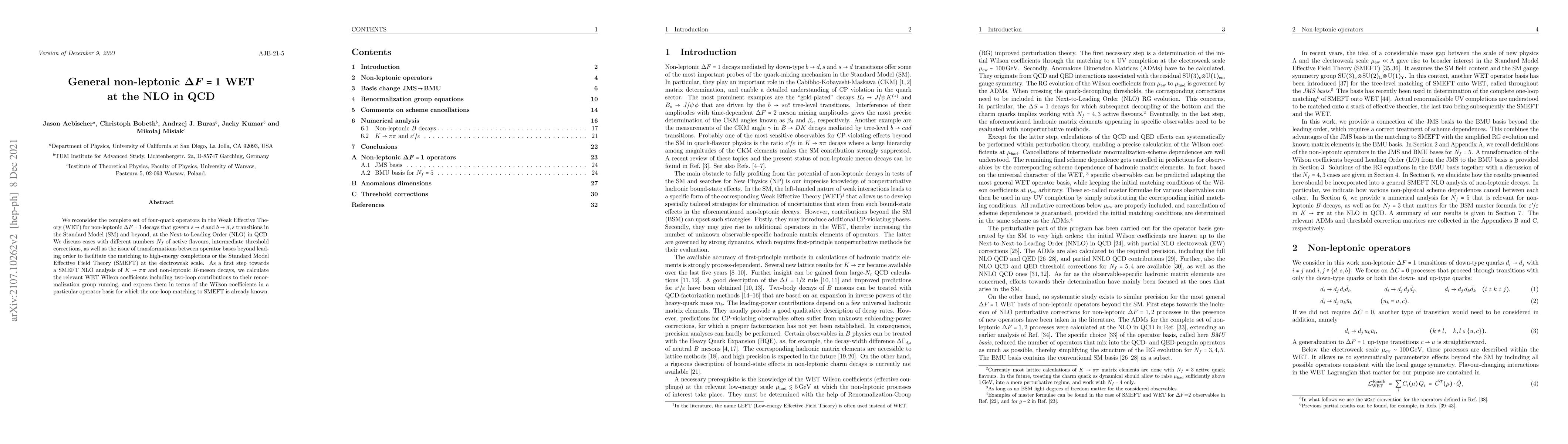 We reconsider the complete set of four-quark operators in the Weak Effective Theory (WET) for non-leptonic $\Delta F=1$ decays that govern $s\to d$ and $b\to d, s$ transitions in the Standard Model (SM) and beyond, at the Next-to-Leading Order (NLO) in QCD. We discuss cases with different numbers $N_f$ of active flavours, intermediate threshold corrections, as well as the issue of transformations between operator bases beyond leading order to facilitate the matching to high-energy completions or the Standard Model Effective Field Theory (SMEFT) at the electroweak scale. As a first step towards a SMEFT NLO analysis of $K\to\pi\pi$ and non-leptonic $B$-meson decays, we calculate the relevant WET Wilson coefficients including two-loop contributions to their renormalization group running, and express them in terms of the Wilson coefficients in a particular operator basis for which the one-loop matching to SMEFT is already known.