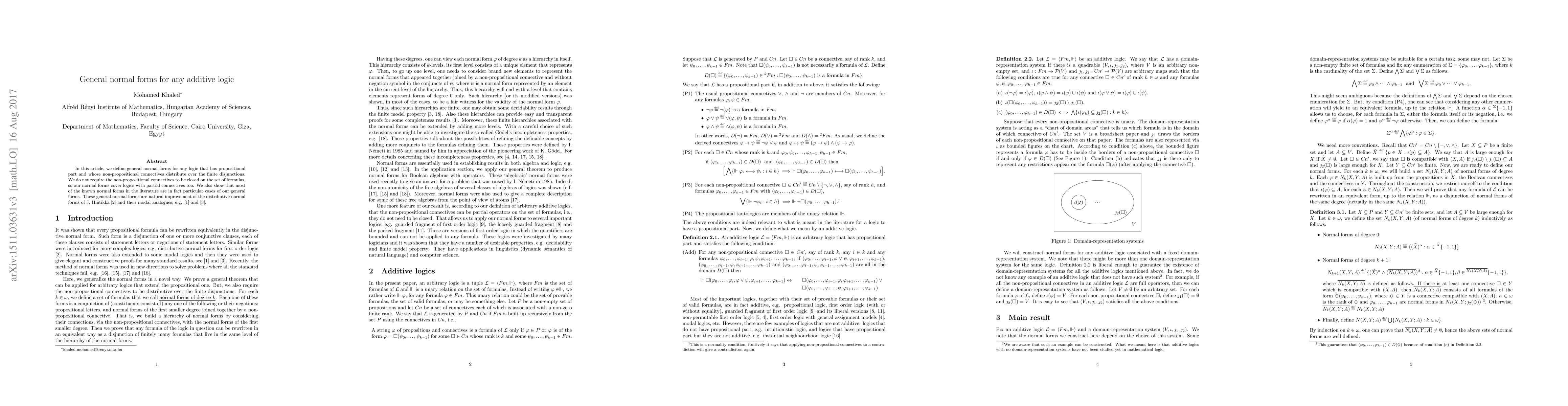 This paper defines general normal forms for any additive logic where non-propositional connectives distribute over finite disjunctions, including logics with partial connectives. It demonstrates that many known normal forms are specific instances of these new general forms.