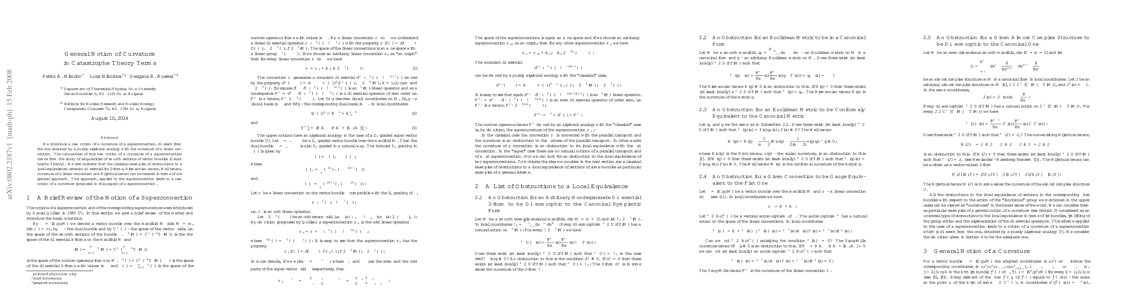 We introduce a new notion of a curvature of a superconnection, different from the one obtained by a purely algebraic analogy with the curvature of a linear connection. The naturalness of this new notion of a curvature of a superconnection comes from the study of singularities of smooth sections of vector bundles (Catastrophe Theory). We demonstrate that the classical examples of obstructions to a local equivalence: exterior differential for 2-forms, Riemannian tensor, Weil tensor, curvature of a linear connection and Nijenhuis tensor can be treated in terms of one general approach. This approach, applied to the superconnection leads to a new notion of a curvature (proposed in this paper) of a superconnection.