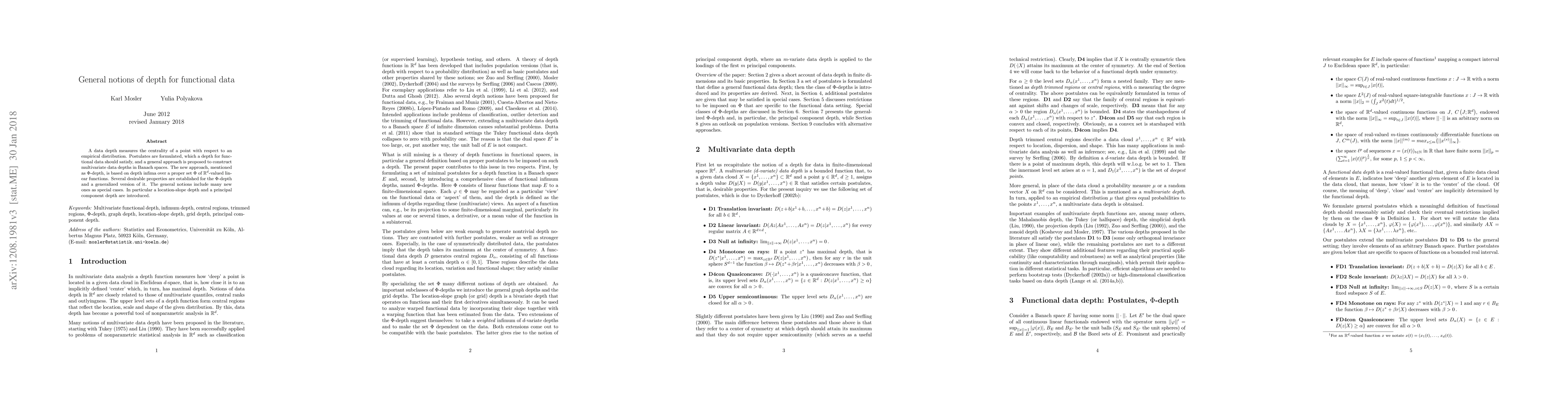 A data depth measures the centrality of a point with respect to an empirical distribution. Postulates are formulated, which a depth for functional data should satisfy, and a general approach is proposed to construct multivariate data depths in Banach spaces. The new approach, mentioned as Phi-depth, is based on depth infima over a proper set Phi of R^d-valued linear functions. Several desirable properties are established for the Phi-depth and a generalized version of it. The general notions include many new depths as special cases. In particular a location-slope depth and a principal component depth are introduced.